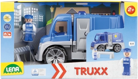 Tugev kvaliteetsest plastist politseiauto lastele alates 2. eluaastast. Pakub mehaanilisi funktsioone ilma patareideta, avamiseks mõeldud uksi, üleskäänatavat kabiini ja kilbiga politseiniku figuuri loominguliseks mänguks kodus ja liivakastis.