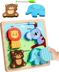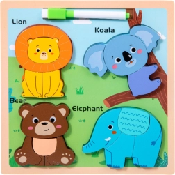Puidust hariv pusle metsloomade motiiviga on mitmekülgne mänguasi, mis arendab lapse motoorseid ja kognitiivseid oskusi. See pusle sisaldab nelja värvilist metslooma kuju: lõvi, koala, karu ja elevant, mis tuleb sobitada õigetele kohtadele.