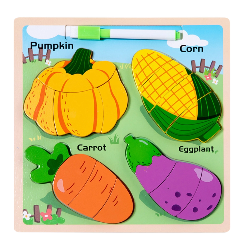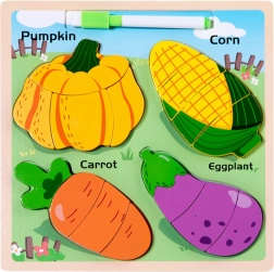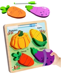 See puidust pusle annab lastele suurepärase võimaluse õppida kujundeid ja treenida peenmotoorikat. Komplektis on neli populaarset köögivilja: kõrvits, mais, porgand ja baklažaan. Iga element on jaotatud väiksemateks osadeks, mida lapsed paigutavad vastavatele kohtadele alusel.