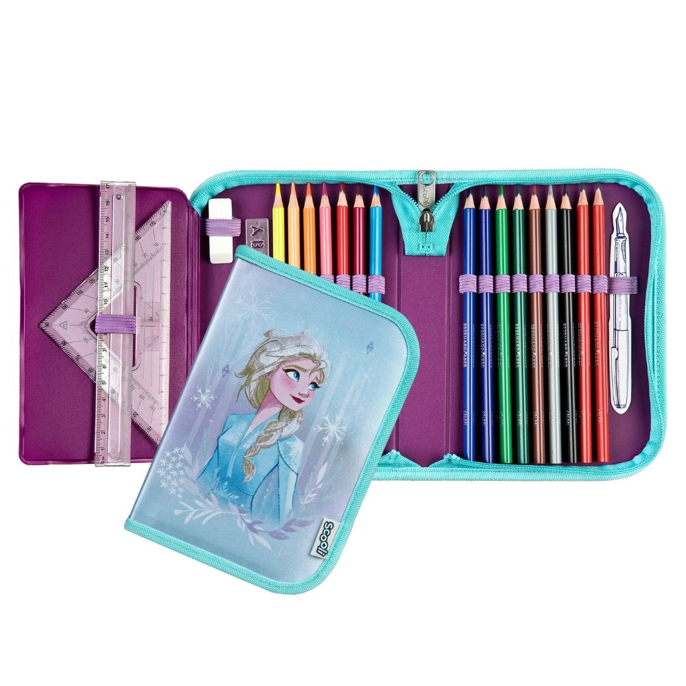 Undercoveri Frozeni pinal toob teieni armastatud filmi Jääkuninganna disaini, mis meeldib nii väiksematele kui suurematele lastele. Valmistatud vastupidavast polüestrist, mis tagab pika kasutusea ja sisu kaitse. Mõõtmetega 14 × 20 × 3 cm pakub see piisavalt ruumi täielikule koolitarvete komplektile, sealhulgas 14 värvipliiatsile, pliiatsitele, joonlauale ja muudele tarvikutele.