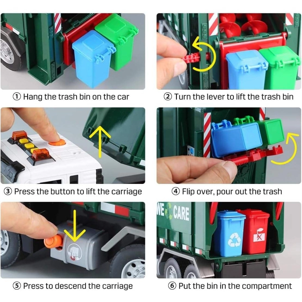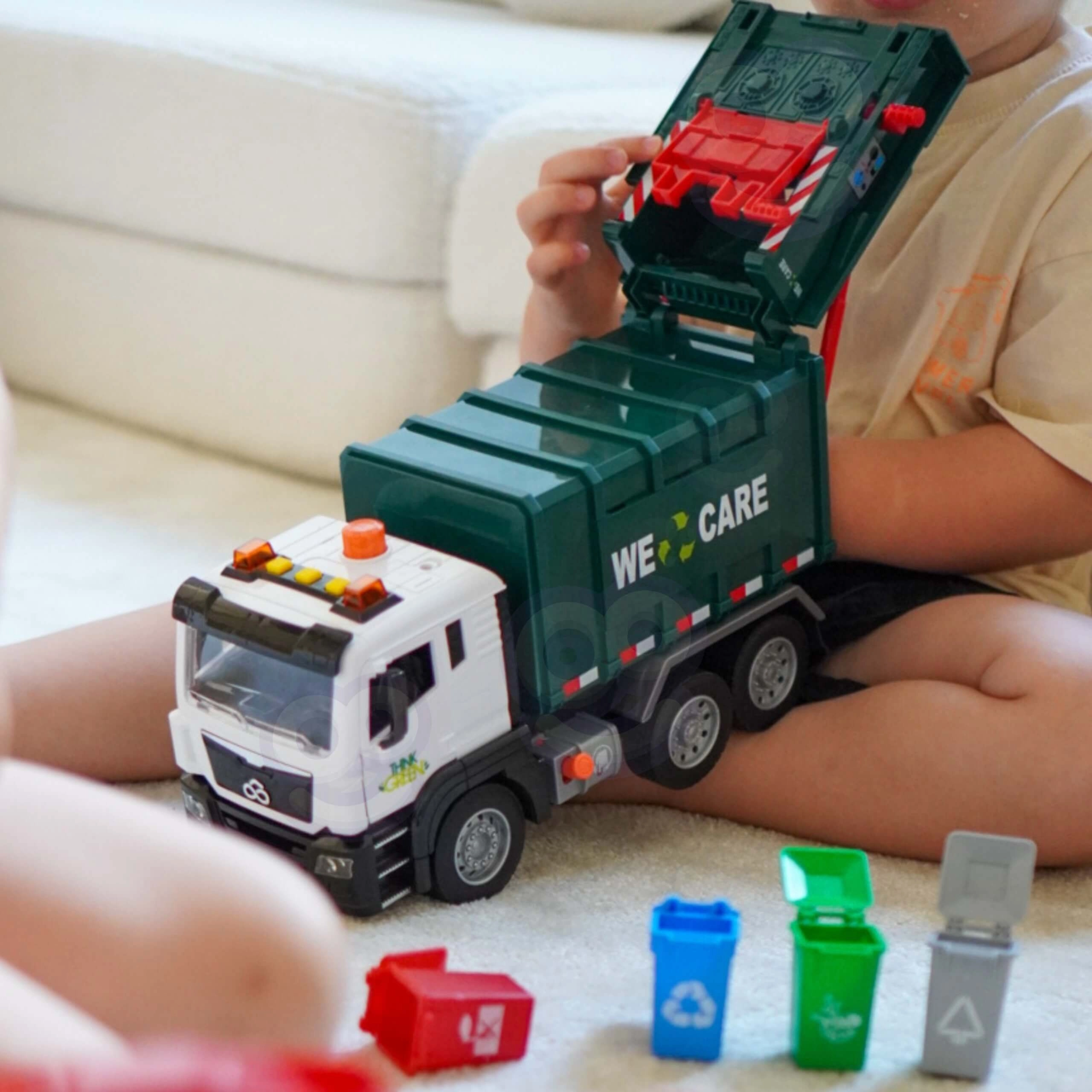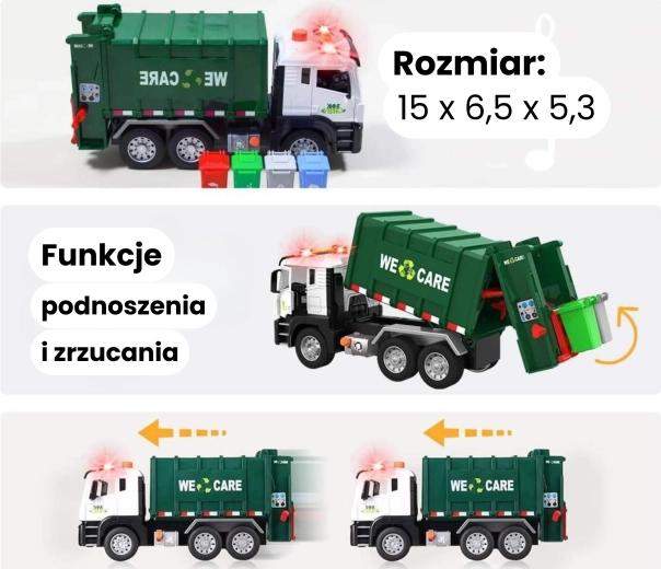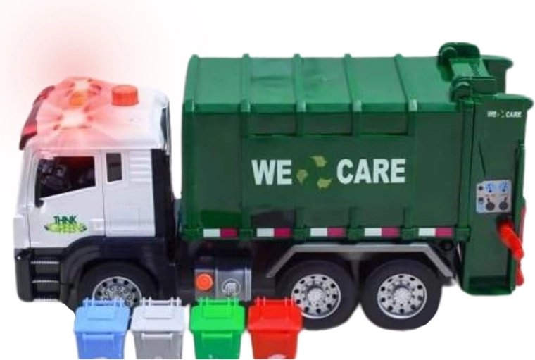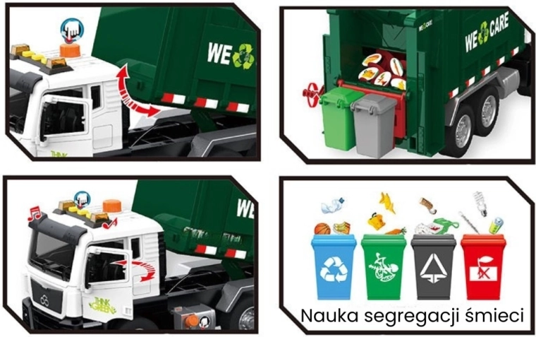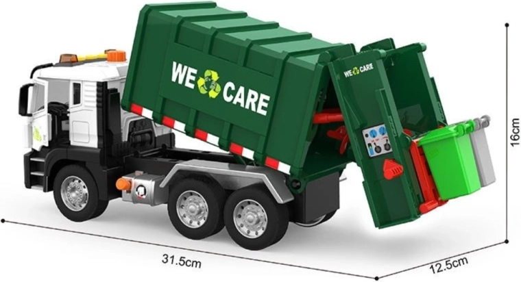 See detailselt viimistletud prügiveoauto kirjaga „WE CARE” pakub lastele autentset jäätmeveo rollimängu. Tänu toimivale tõstearmile, avatavale tagaluugile ja kaasasolevatele miniprügikastidele saavad lapsed proovida jäätmete sorteerimise ja väljaveo tegelikke võtteid. Integreeritud valgus- ja heliefektid suurendavad lõbu ja innustavad kujutlusvõimet.