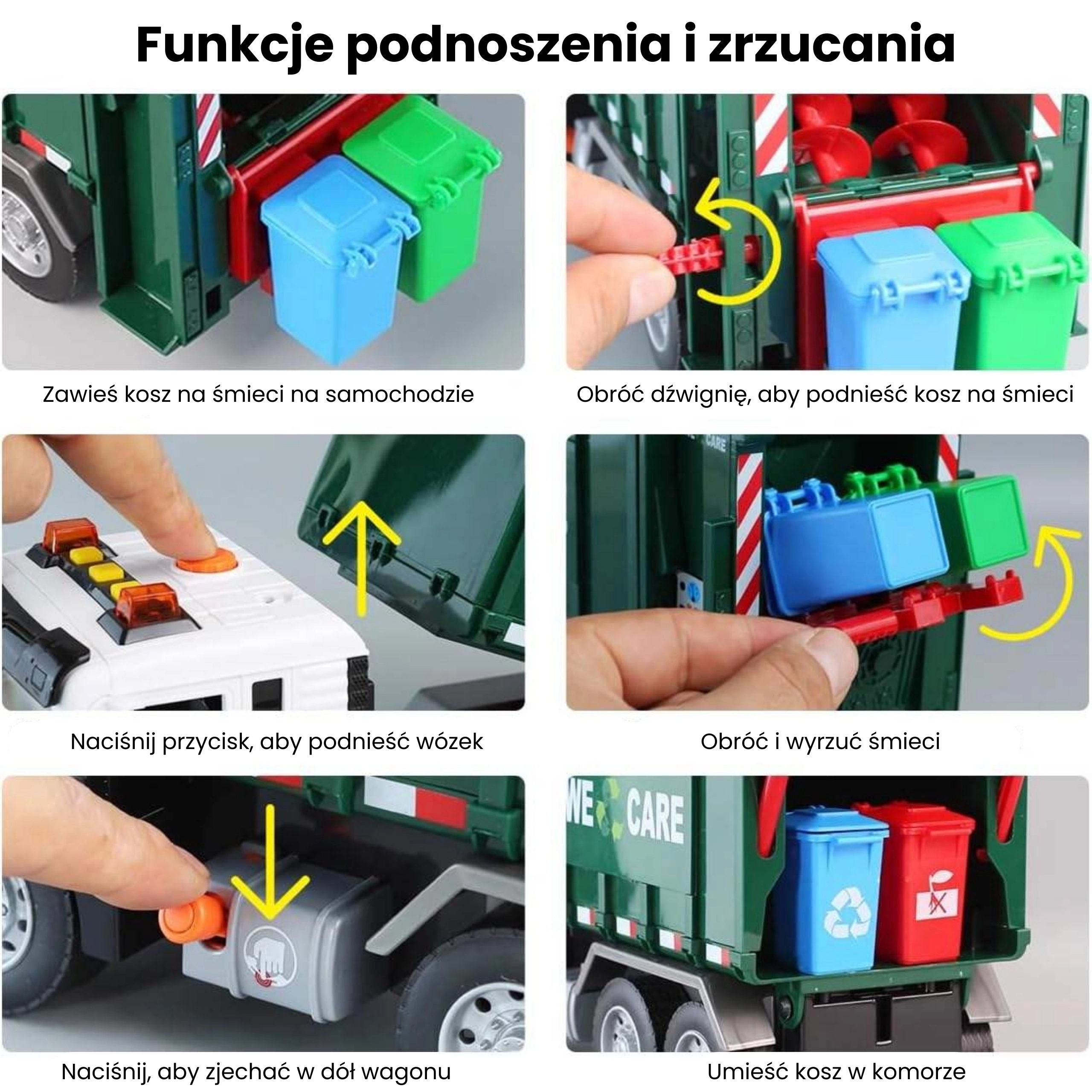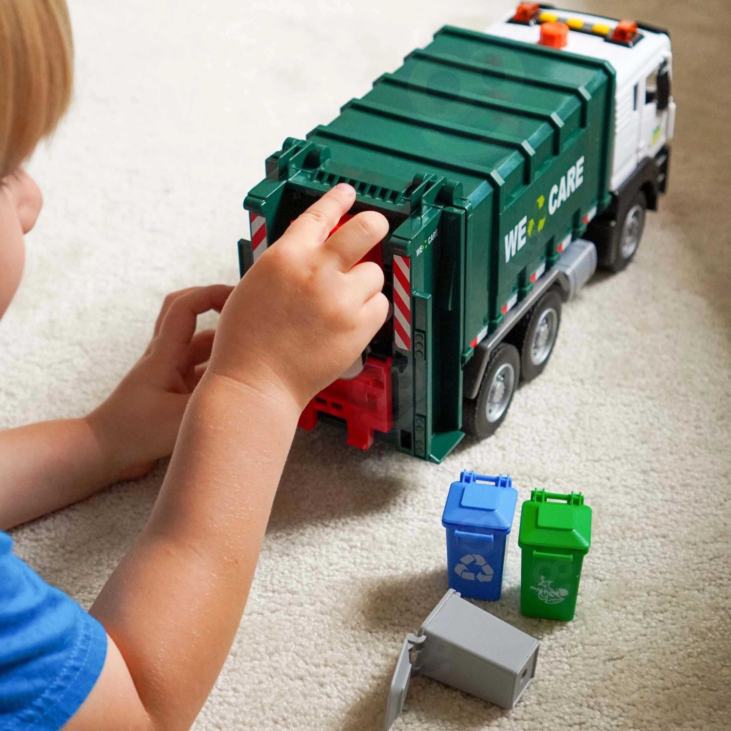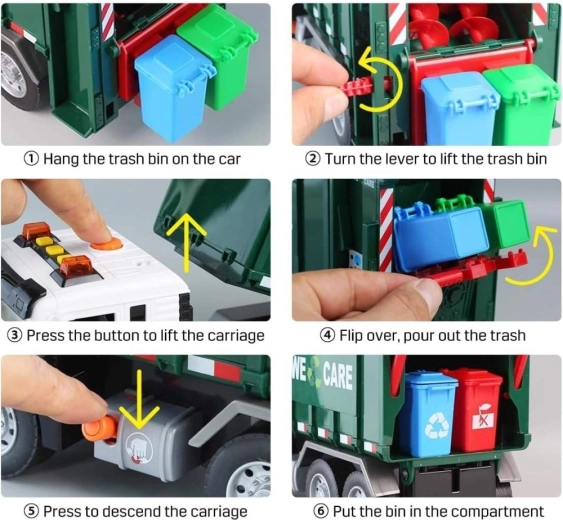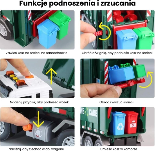 See detailselt viimistletud prügiveoauto kirjaga „WE CARE” pakub lastele autentset jäätmeveo rollimängu. Tänu toimivale tõstearmile, avatavale tagaluugile ja kaasasolevatele miniprügikastidele saavad lapsed proovida jäätmete sorteerimise ja väljaveo tegelikke võtteid. Integreeritud valgus- ja heliefektid suurendavad lõbu ja innustavad kujutlusvõimet.