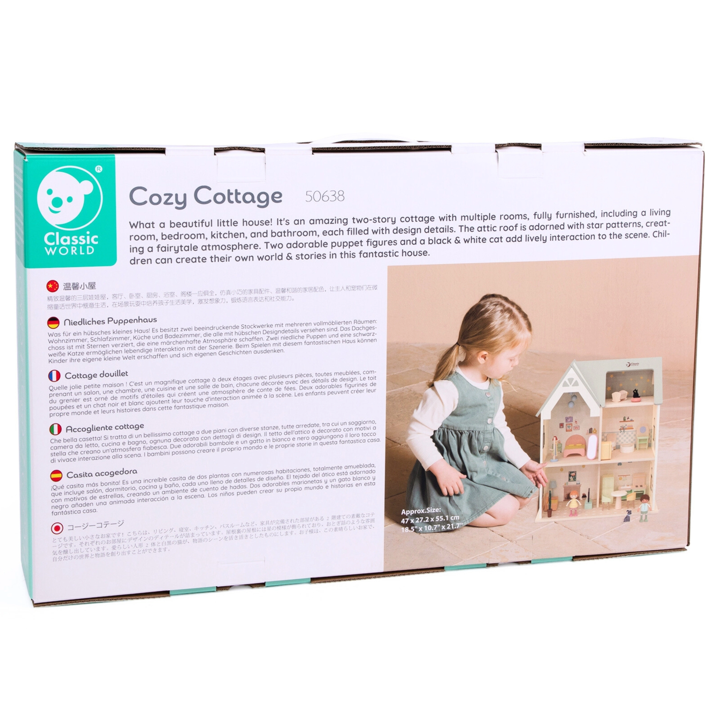 Classic Worldi sisustusega puidust nukumaja pakub kaunist kahekorruselist maja pööninguga, mis on ideaalne väikestele loova mängu austajatele.