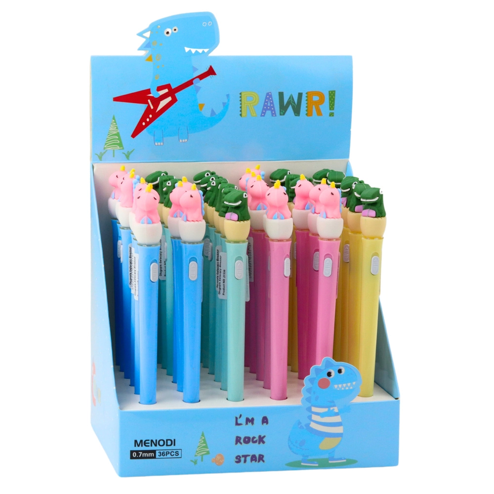 Pliiatsi ülaosa kaunistab kummist dinosauruse kuju, mis toimib dekoratiivse elemendina ja lisab kogu komplektile võlu. Tänu korgile on kirjutusots hästi kaitstud kuivamise eest ning sisseehitatud nupp aktiveerib efektse LED-valgustuse, mis süttib igal vajutusel.