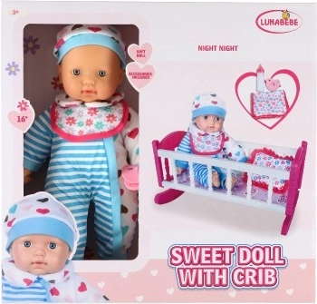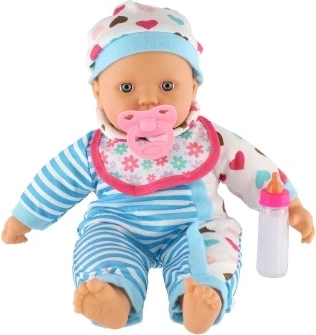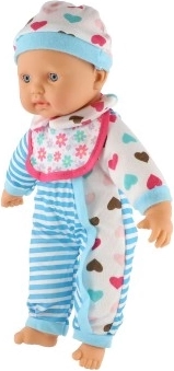 Nukk on riietatud sinivalgesse triibulisse kleiti, mida kaunistavad armsad südamed. Kaasas on lutt ja pudel, mis lisavad mängule realistliku nüansi.