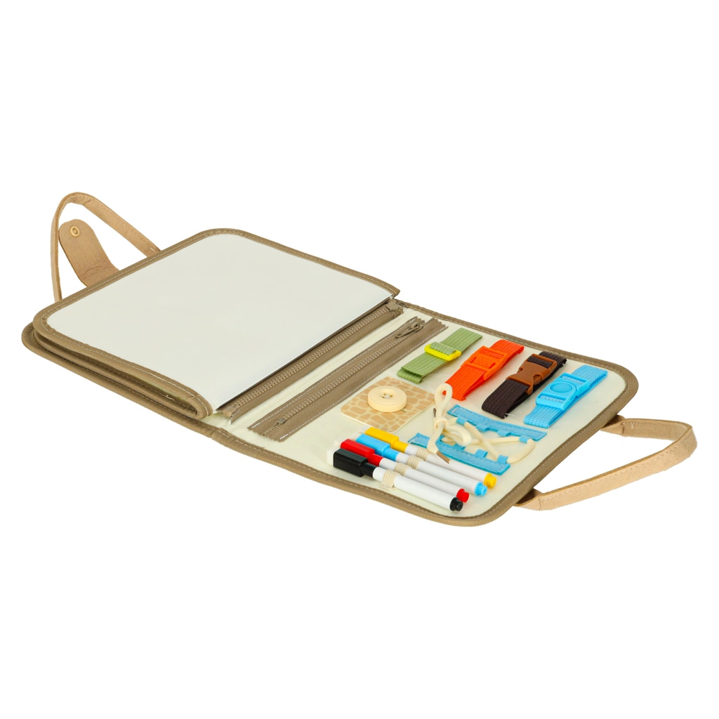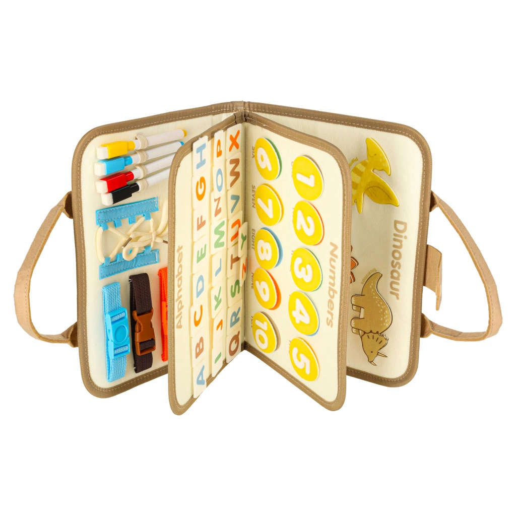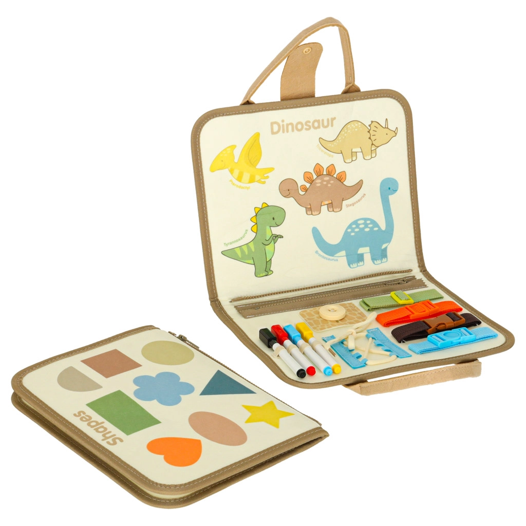 Montessori sensoorne kohver dinosaurustega ühendab avastamisrõõmu ja õppimise. Nööpide, tõmblukkude, klambrite ja teiste elementide abil saavad lapsed oma oskusi lõbusal viisil harjutada. See kompaktne ja visuaalselt atraktiivne kohver sobib suurepäraselt koju või reisile.
