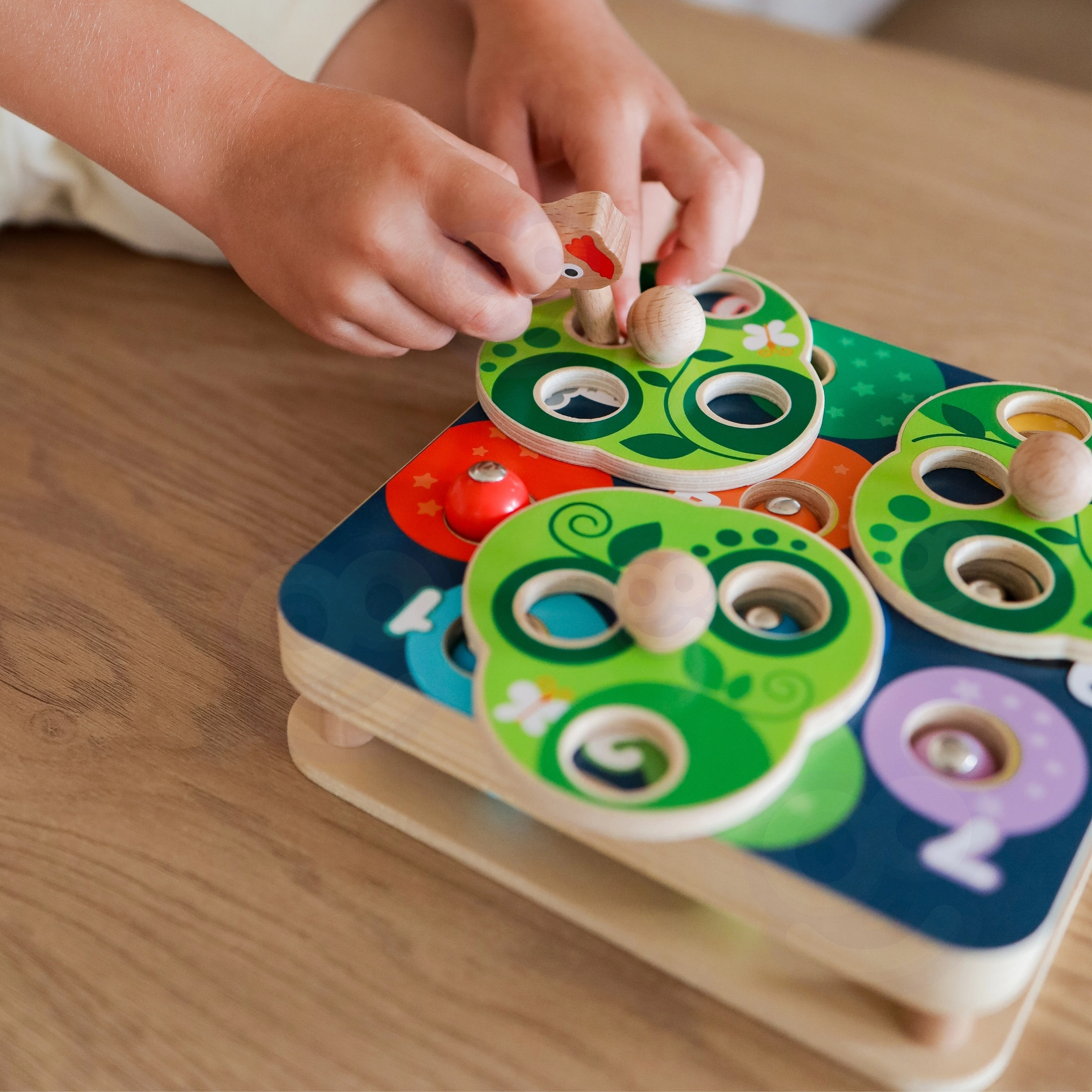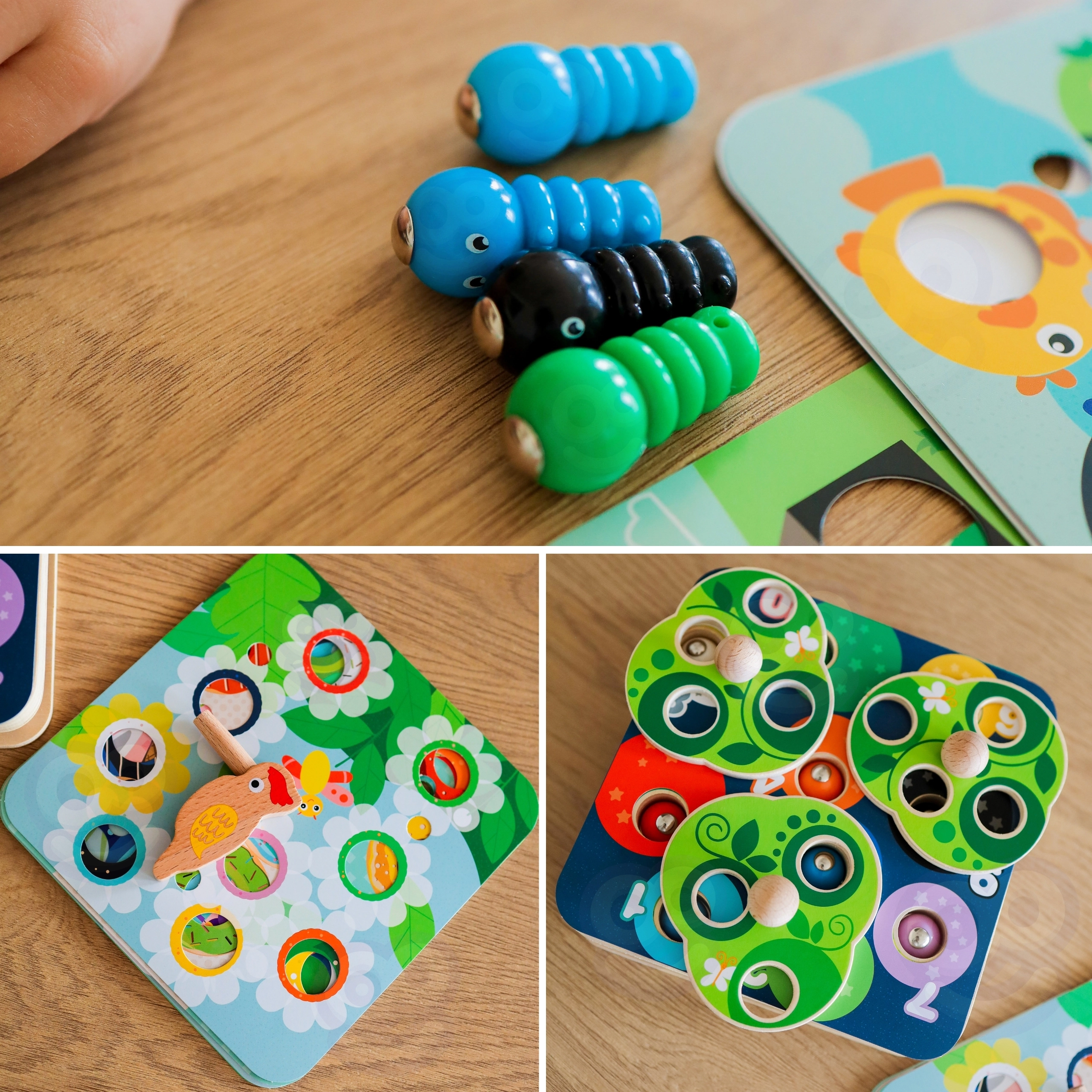 Rohelised pööratavad kettad peidavad ussikesi ja loovad üllatusi täis dünaamilise mängu. Lapsed peavad lehti keerama, otsima ja paigutama tööriista õigesti.
