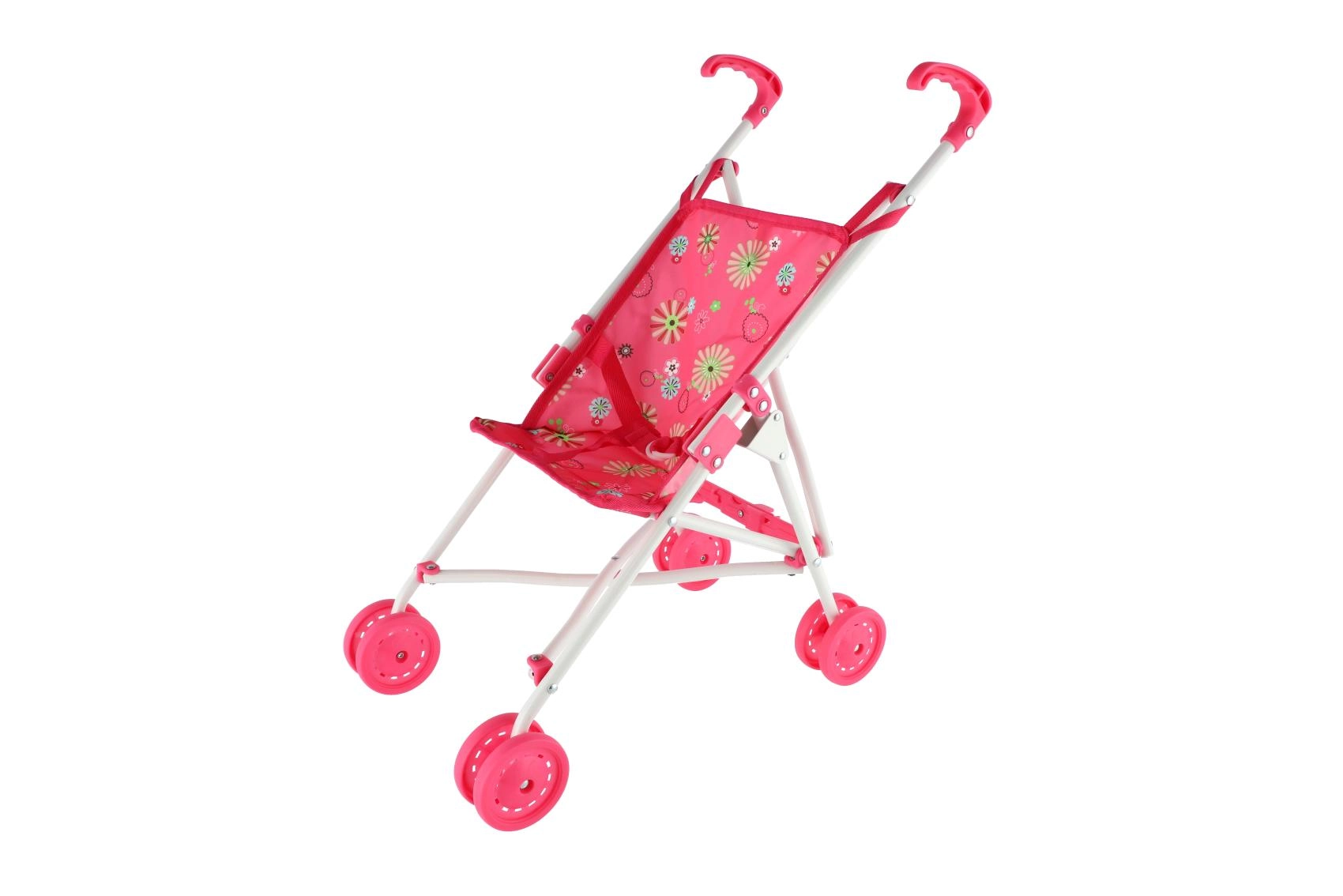 See roosa õiemustriga nukukäru on praktiline, kerge ja mõeldud igapäevaseks mänguks. Lapsed hindavad mugavaid käepidemeid, nelja topeltratast sujuvaks veeremiseks ning turvavööd, mis hoiab nuku kindlalt paigal. Konstruktsioon on metallist, kate vastupidavast kangast – lihtne hooldada ja kestab kaua.