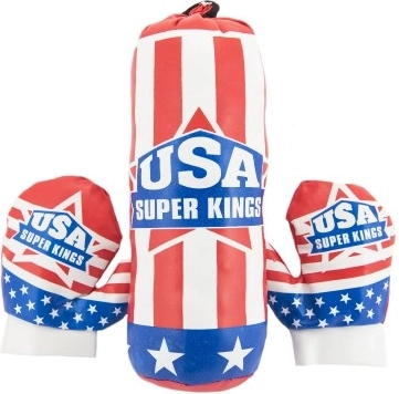 Lõbus ja ohutu komplekt väikestele sportlastele: laste poksikott kinnastega Ameerika lipu motiiviga. Ideaalne energia väljaelamiseks, koordinatsiooni arendamiseks ja mänguliseks tegevuseks. Kerge ja kompaktne, lihtsasti kaasaskantav ja sobib alates 3. eluaastast.