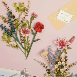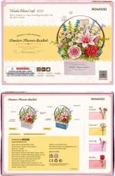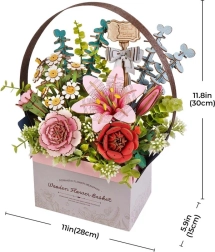 Komplekt sisaldab kõiki vajalikke osi: puidust korv, roosa liilia, punane roos, kummel, roosa nelk, eukalüpt ja dekoratiivtaimed. See komplekt tarnitakse kokkupanemata kujul koos üksikasjaliku juhendiga.