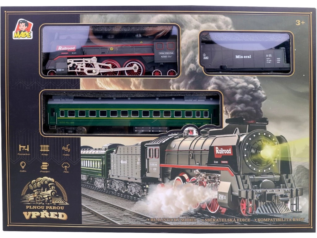 See rongikomplekt on täiuslik valik kõigile väikestele raudteesõpradele. Komplektis on realistliku välimusega aurulokomotiiv, mis mitte ainult ei valgusta teed, vaid ka “viletab” mööda sõites. Rongil on ainulaadne auruefekt, mis tuleb korstnast, lisades mängule põnevust ja autentsust.