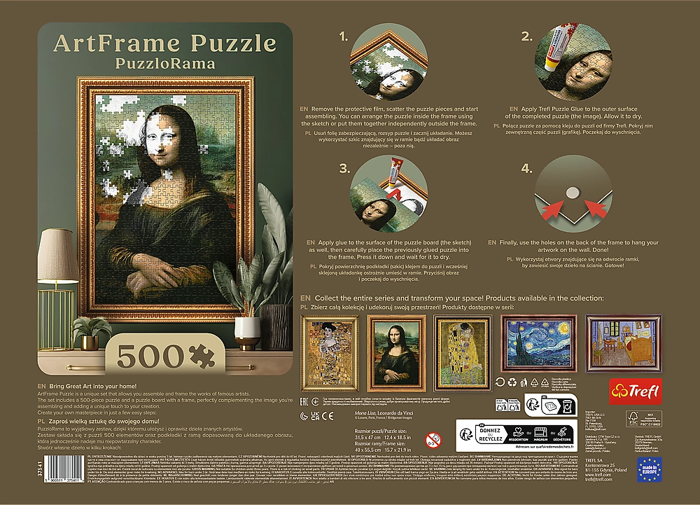 Valmis pildi saate tänu kaasasolevale raamile kohe üles panna. Püsiva tulemuse saavutamiseks soovitame juurde osta pusleliimi. Koguge kogu kollektsioon ja looge oma kodune kunstigalerii!