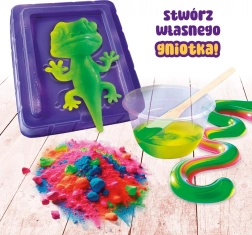 Too mängu loomingu- ja lõbuhetked Slumi Science komplektiga – Antistress-kameeleon! Selle pakiga saab sinu laps kiiresti ja lihtsalt valmistada fantastilise kameeleoni, mis muudab värvi. Protsess on lihtne: sega maagilised vedelikud, lisa värvi muutvat pulbrit, vala segu vormi ja vaata, kuidas kameeleon ellu ärkab.