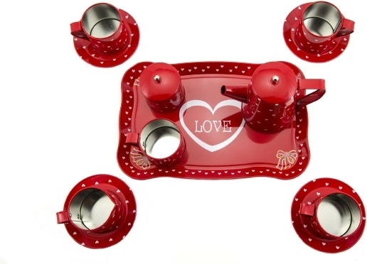 Punast nõudekomplekti kaunistavad valged südamekesed, mis annavad romantilise ja samas mängulise ilme. Iga detail on hoolikalt kokku sobitatud, et luua harmooniline tervik, mis ärgitab laste fantaasiat.