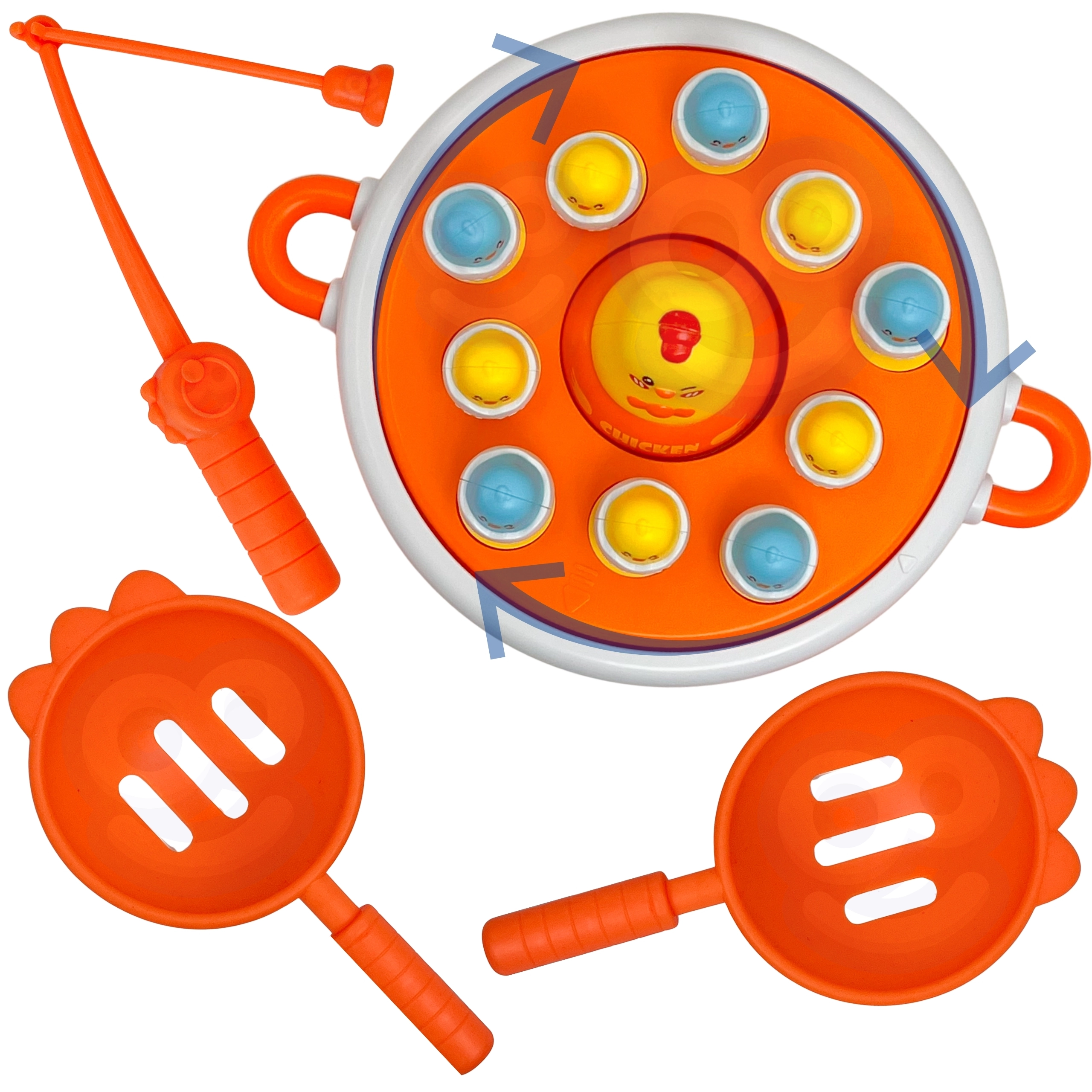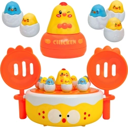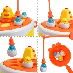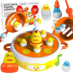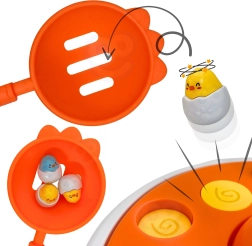 See mitmekülgne mänguasi ühendab kuni neli mängu ühes komplektis, nii et lõbu ei saa niipea otsa. Pöörlev muusikaline alus tõstab tibud juhuslikult esile, mida saab püüda magnetõngega või kühvlitega pärast nende väljalendu katapuldist. Suurem eemaldatav tibu toimib mängulise autokesena.