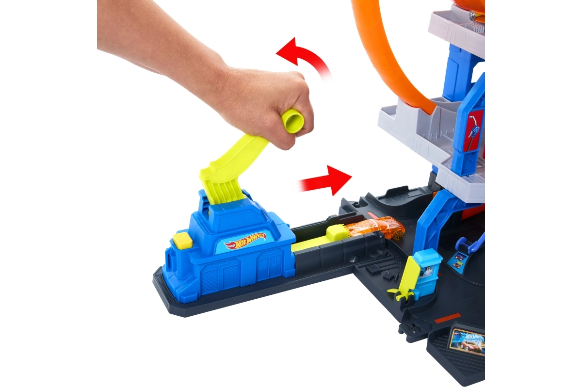 Hot Wheels City maxi-garaaž toob dünaamilise mängu kolmel korrusel – alates autopesulast esimesel korrusel kuni käsilifti ja ülemise korruse stardini. Stardiseade suunab autod topeltsilmusesse, lülitid otsustavad, millisele korrusele auto jõuab. Suurepärane nii üksi kui ka koos mängimiseks.