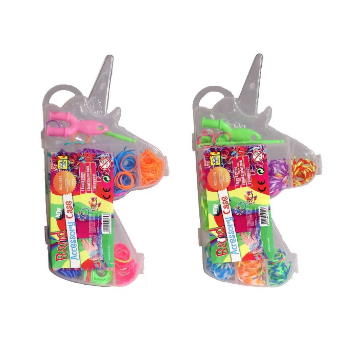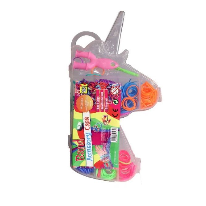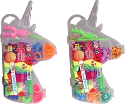 Kõik on korrapäraselt pakitud praktilisse ükssarviku kujulisse plastkarpi, milles on väiksemad eraldatud lahtrid kummide mugavaks värvi järgi sorteerimiseks. See komplekt on mitte ainult lõbus, vaid arendab ka laste loovust ja peenmotoorikat.