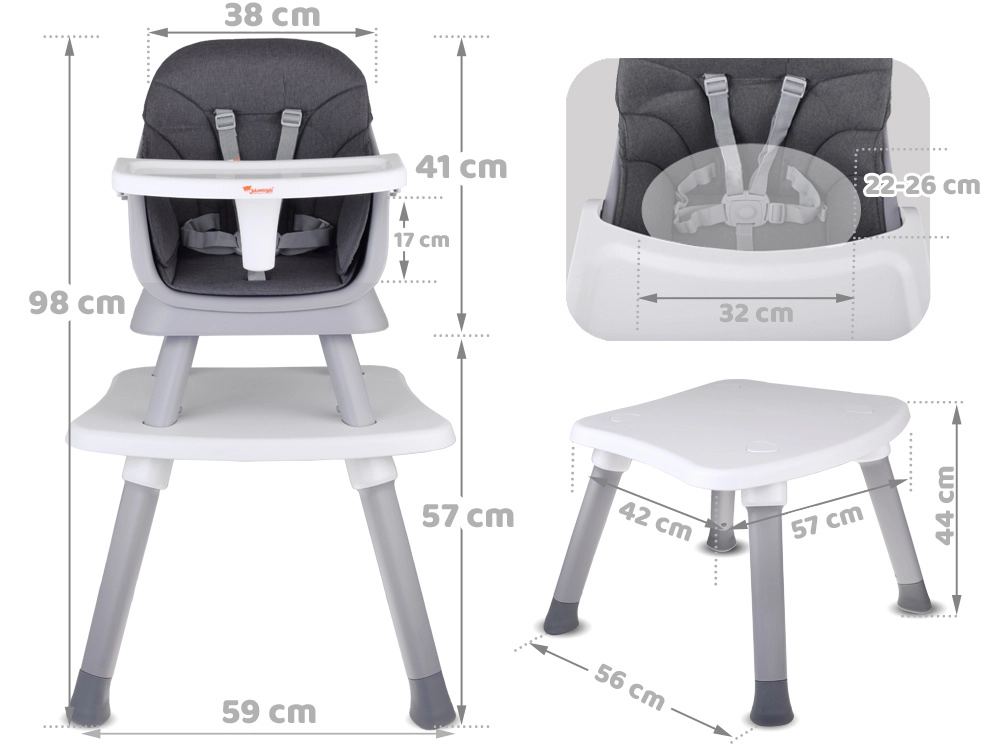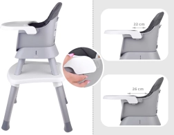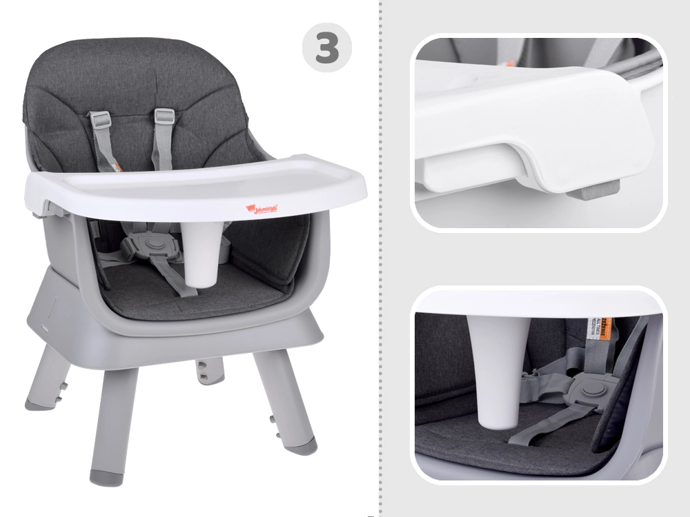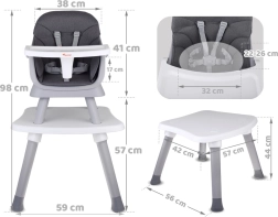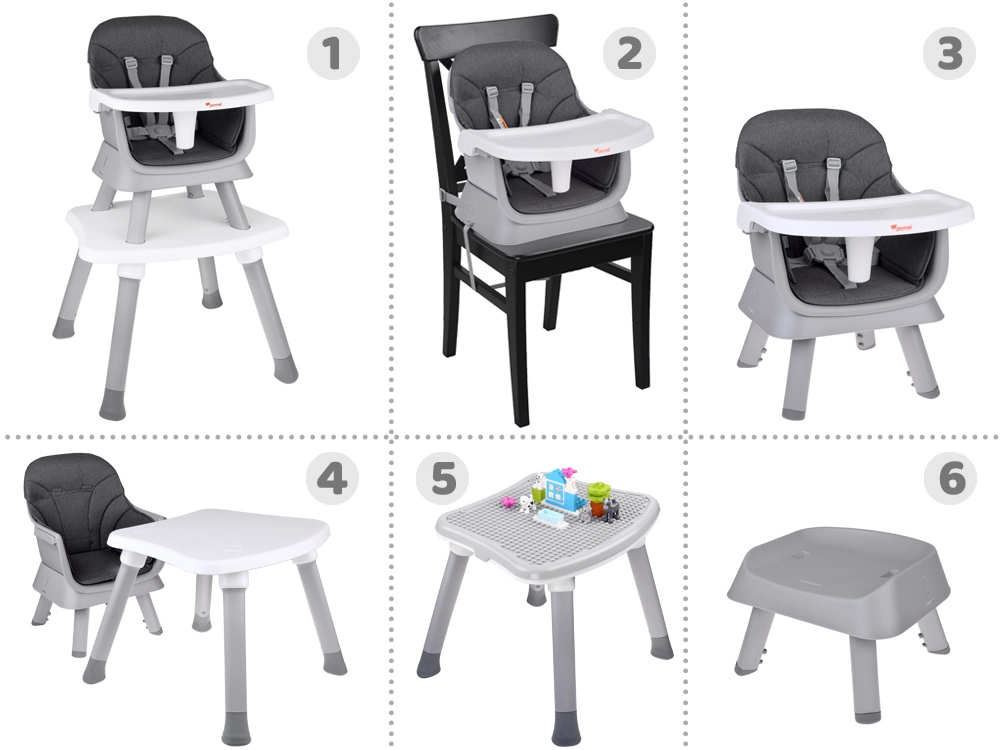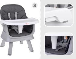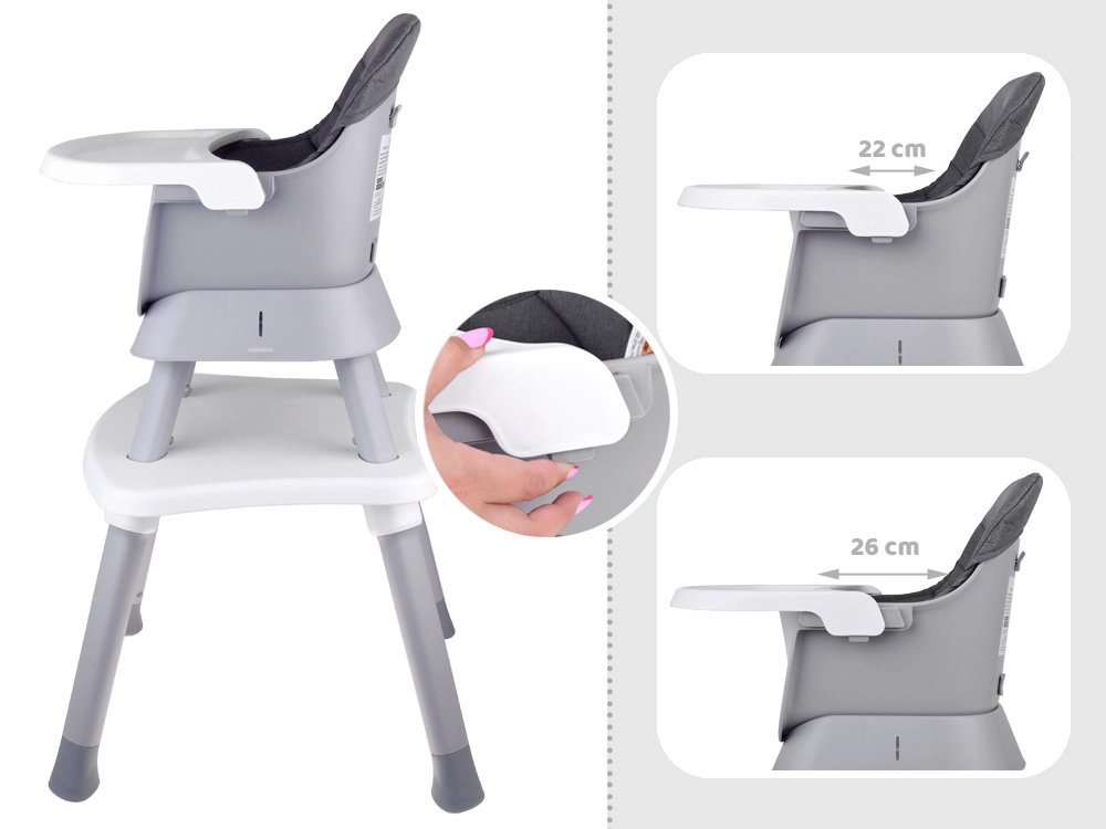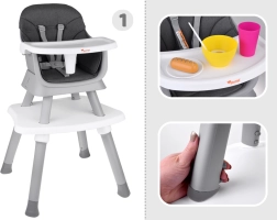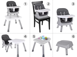 Multifunktsionaalne söögitool 6-ühes on ideaalne lahendus vanematele, kes otsivad praktilist ja stiilset varustust, mis kohandub lapse muutuvate vajadustega. Alates iseseisvaks söömiseks mõeldud söögitoolist kuni lastetabureti ja täieliku lauakomplektini mängimiseks ja õppimiseks.