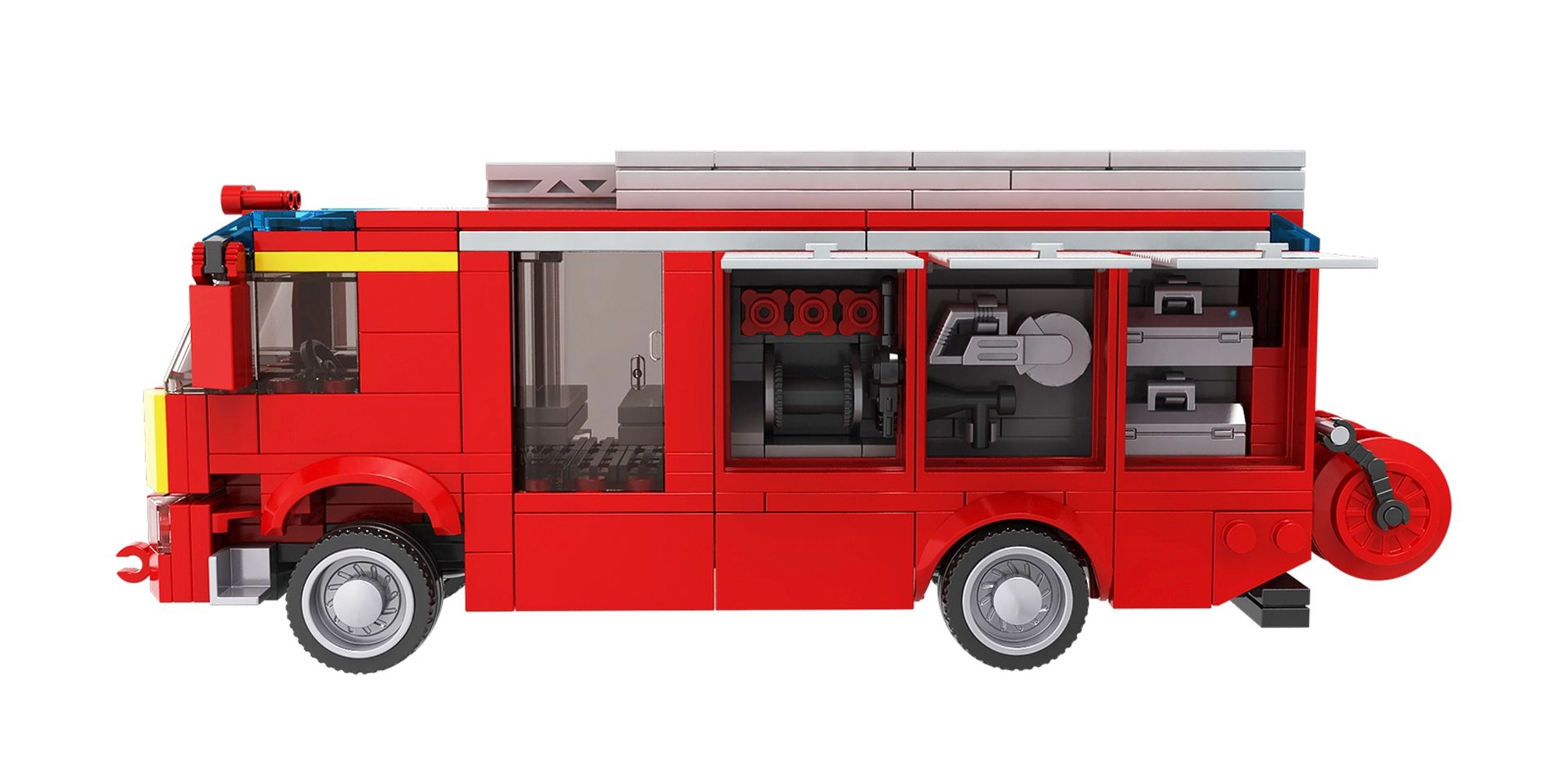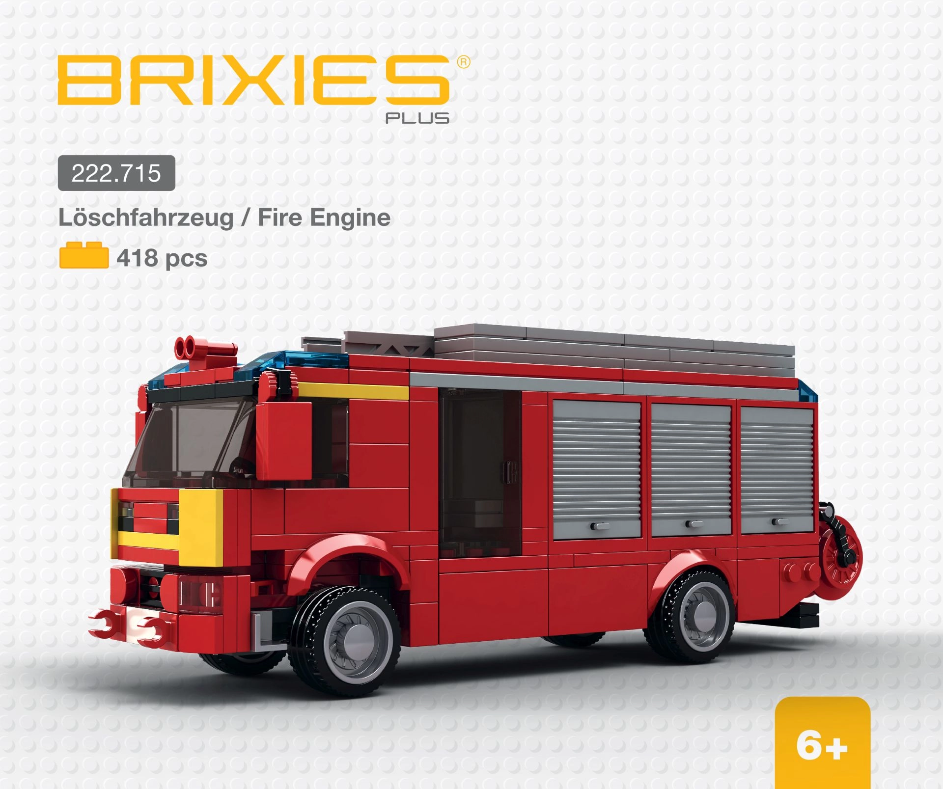 Brixies Plus tuletõrjeauto komplekt võimaldab ehitada detailse tuletõrjeauto mudeli. Üldmõõtudega 21,6 × 8,3 × 7 cm pakub see autentseid detaile ja kvaliteetset teostust.