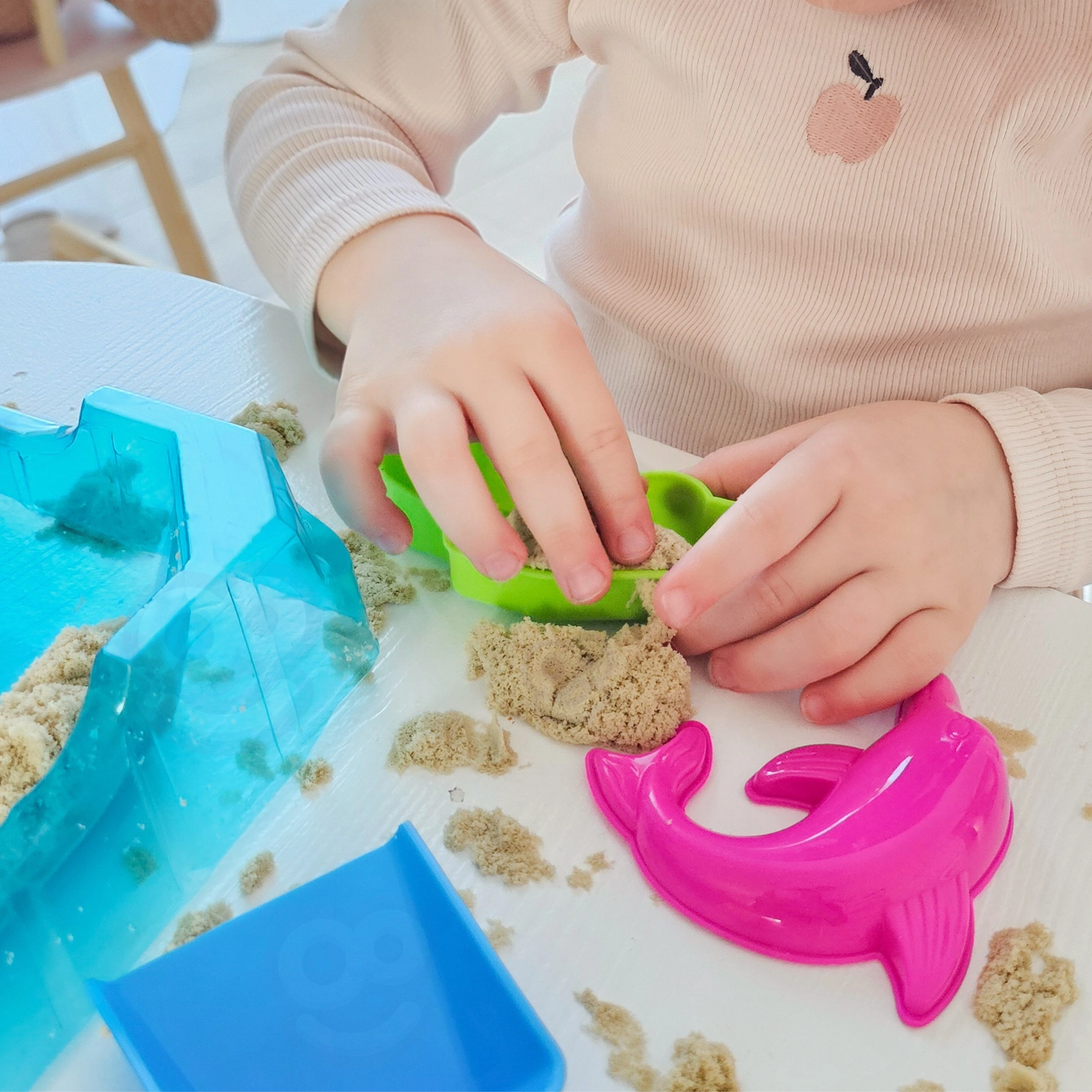Komplekti kuulub kompaktne alus, mis toimib kaasaskantava liivakastina ja aitab mängu ajal korda hoida. Pakist leiad ka labida, rehakesed, taignarulli ning värvilised vormid (nt delfiin, auto, laev, vedur), nii et loometöö on lihtne ja inspireeriv.