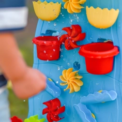 Lai alus ja mõlemalt poolt ligipääsetav sein võimaldavad ühist mängu. Lapsed saavad samaaegselt vett valada, jälgida kaskaade ja pöörlevaid rattaid – ideaalne jagamiseks ja koostööks.