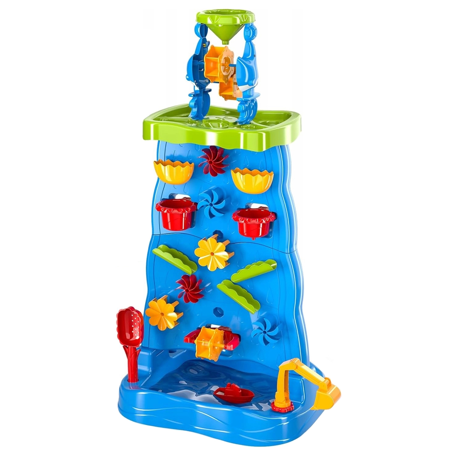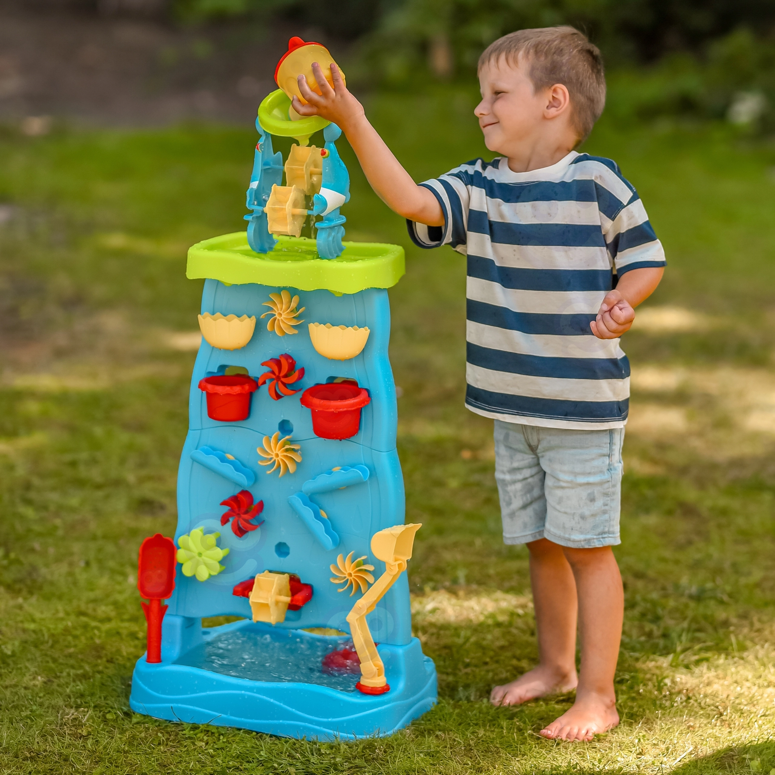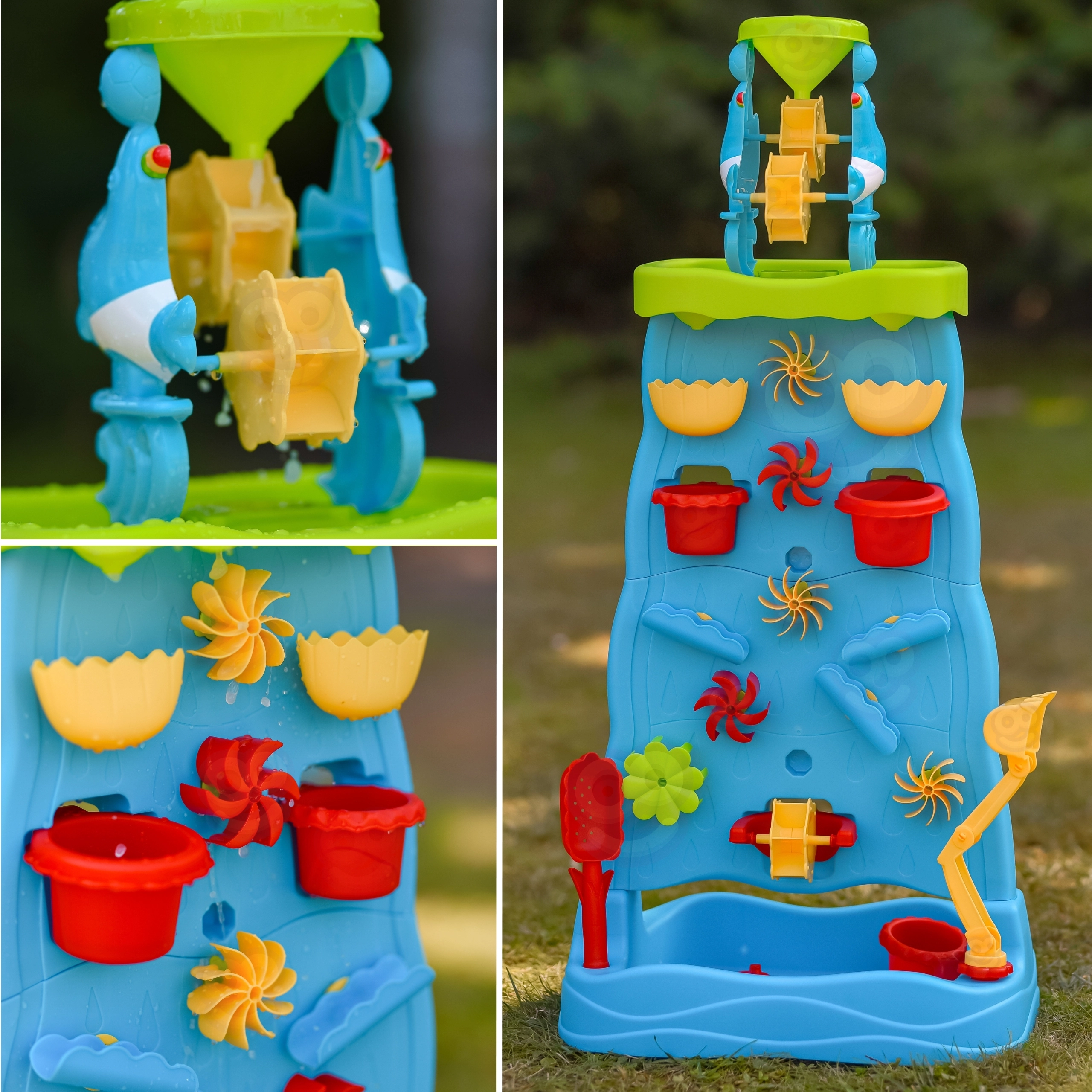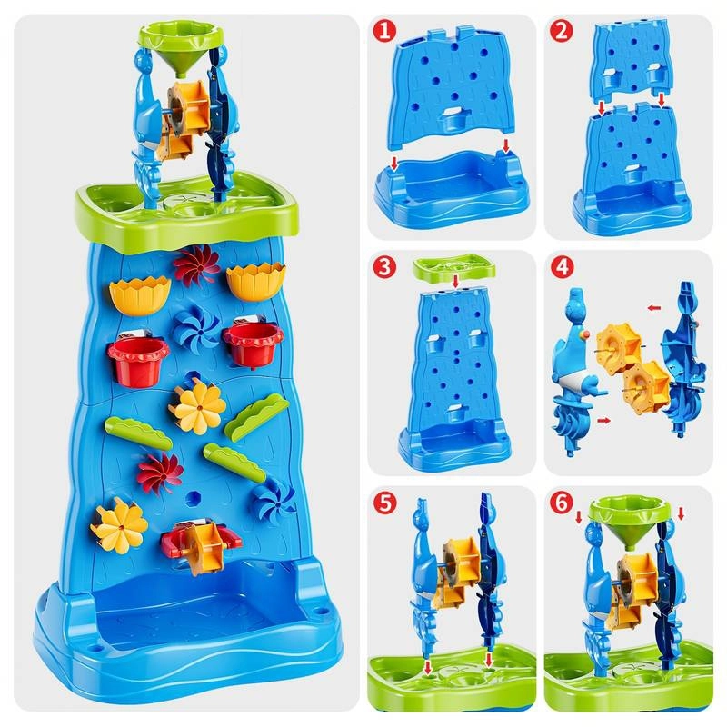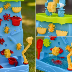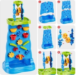 See värvikas veesein kõrge torni ja kaskaadidega pakub lastele lõputult lõbu nii vee kui ka liivaga. Tänu modulaarsele konstruktsioonile saavad nad muuta lehtrite, rennide ja rataste paigutust ning jälgida vee voolamisel põhjuse ja tagajärje seoseid. Kahepoolne lahendus võimaldab mängida samaaegselt mõlemalt poolt – ideaalne õdedele-vendadele ja sõpradele.