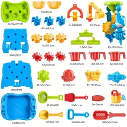 Komplektis on labidad, rehad, sõelad, kastekann, ämber, vormid ja tassid. Nende abil arendavad lapsed peenmotoorikat, loovust ja meeltetundlikkust.
