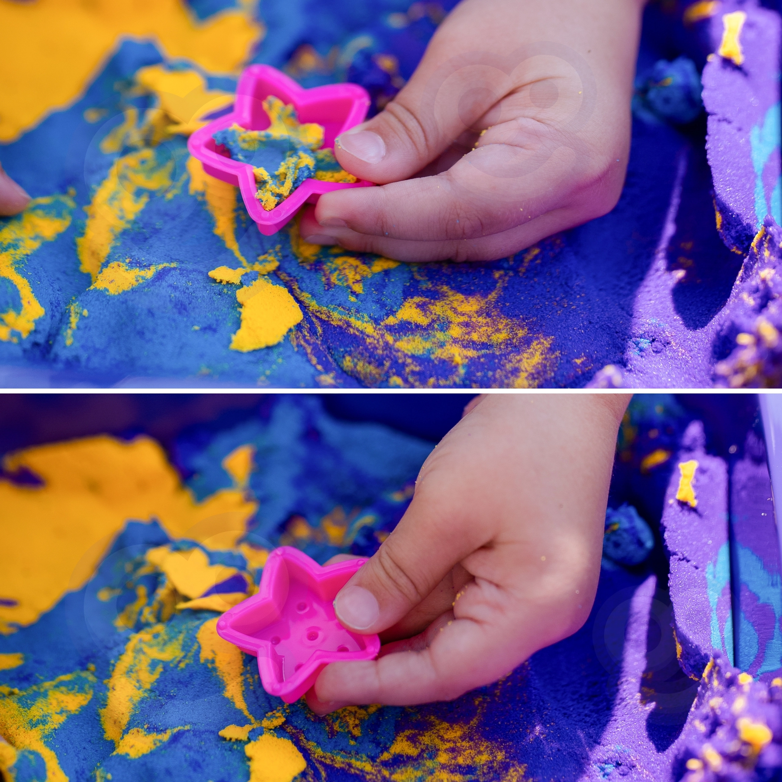 Lapsed saavad liiva pigistada, lõigata ja vormida tähtedeks ning muudeks kujunditeks. Suurepärane meelemängudeks ja peenmotoorika arendamiseks.
