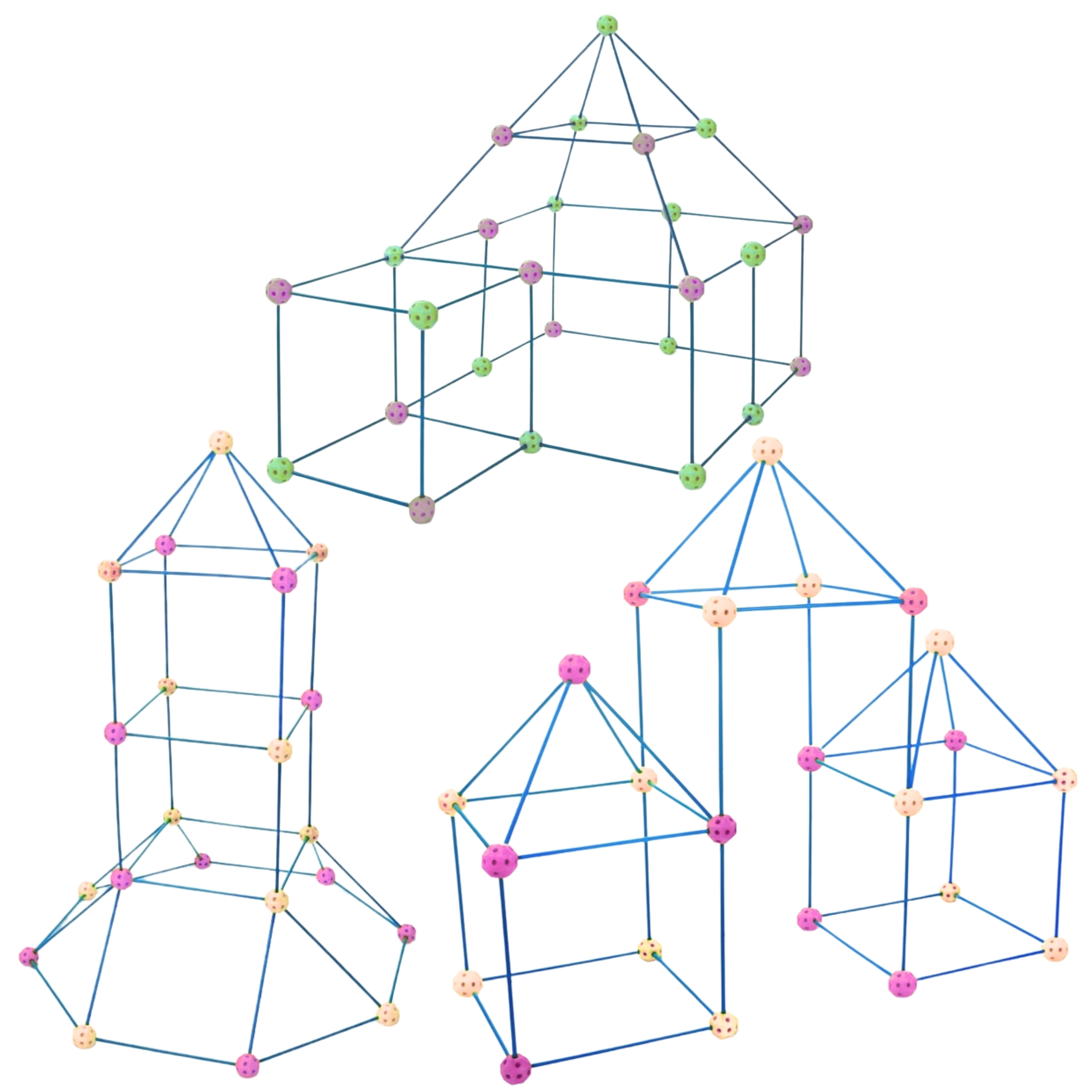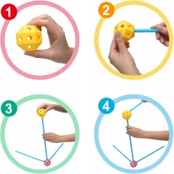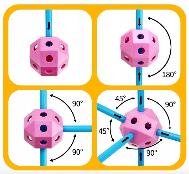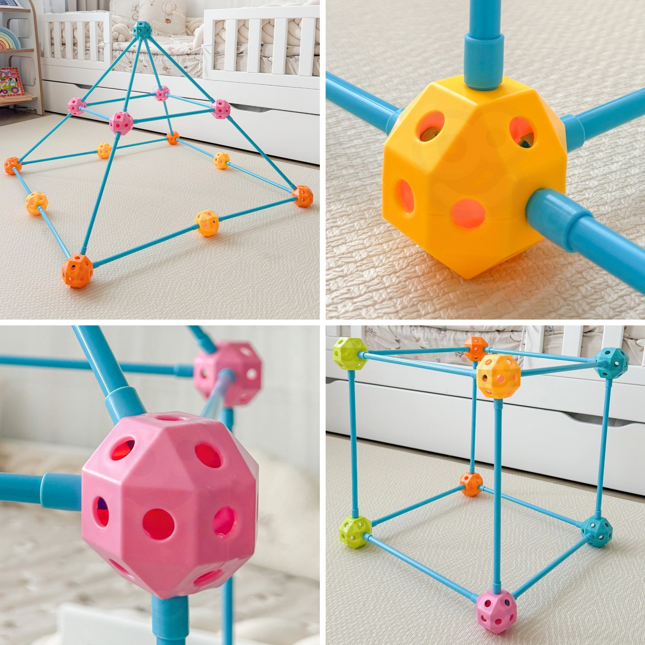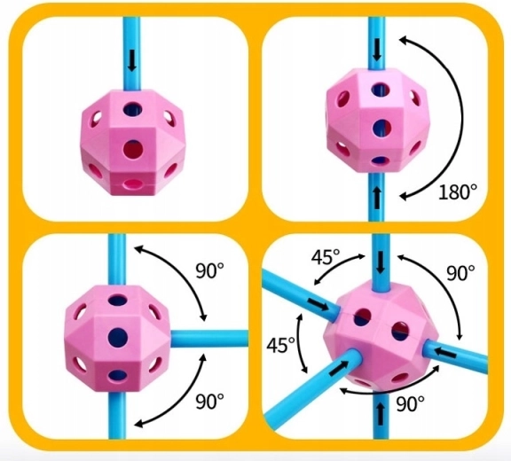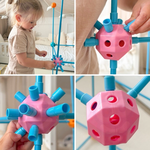 Pikad pulgad ja mitmeavaga pallid tagavad tugevad ühendused erinevate nurkade all. Lapsed loovad kergesti torne, kupleid, maju ja labürinte.