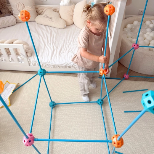 Kerged, siledad ja tugevad osad on loodud väikestele kätele, ilma teravate servadeta ja kiire, intuitiivse ühendamisega. Koos ehitamine arendab meeskonnatööd, kannatlikkust ja ruumilist mõtlemist ning õpetab geomeetria ja inseneeria aluseid.
