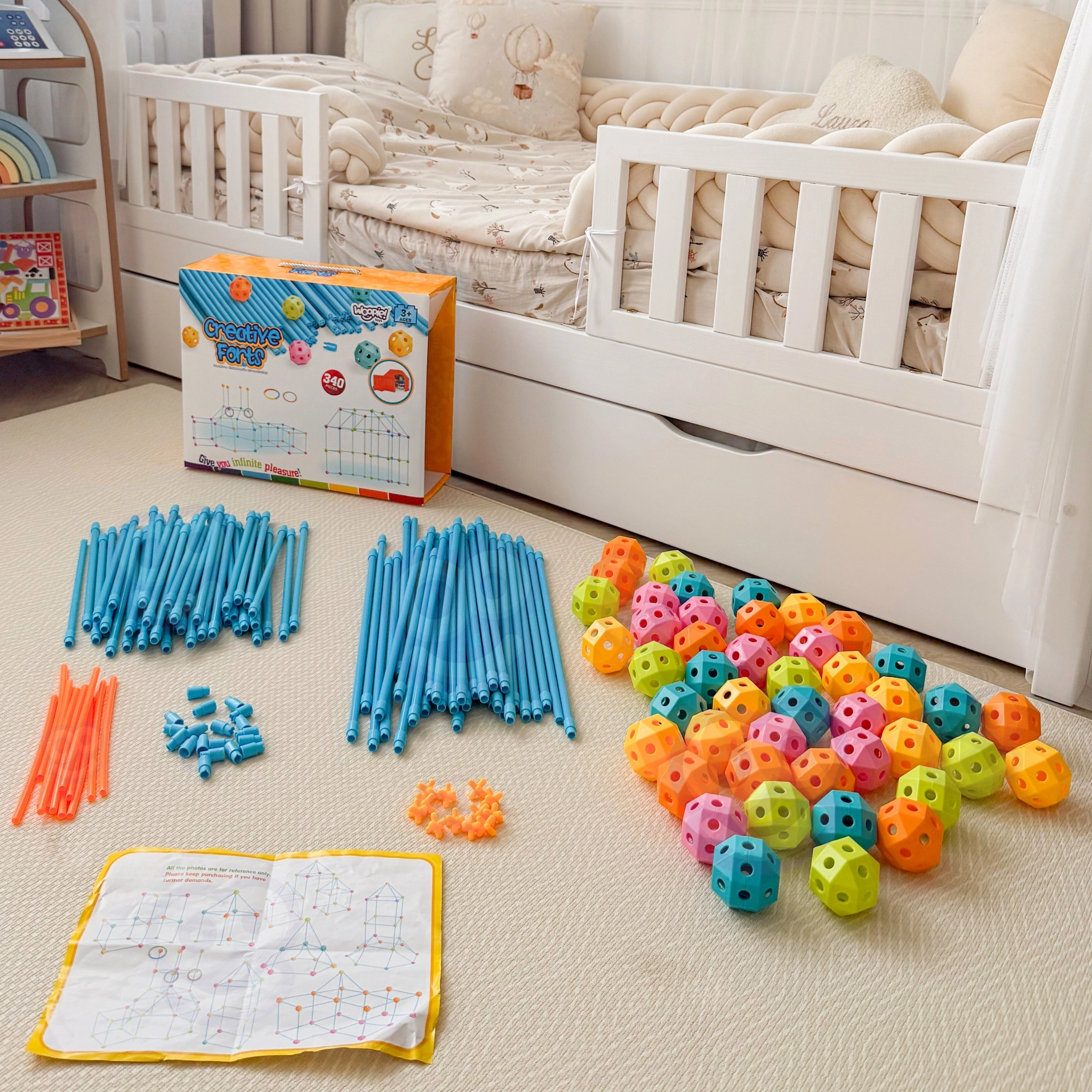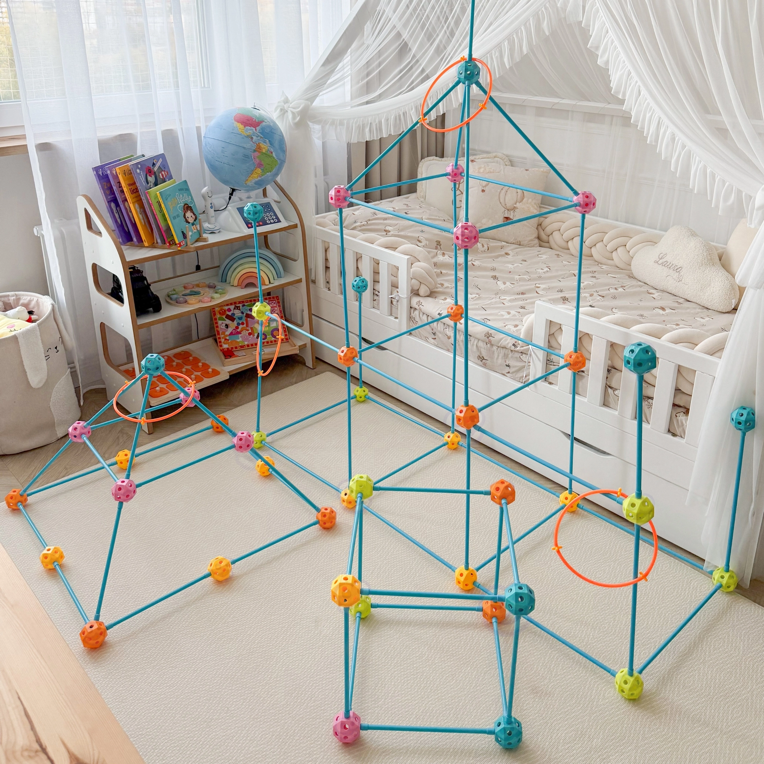 Avastage lõputu lõbu ja õppimine WOOPIE ehituskomplektiga, milles on 340 osa. Kerged plastkõrred ja mitmesuunalised ühenduspallid võimaldavad lastel ehitada maju, kindlusi, tunneleid, torne ja ruumilisi konstruktsioone. Osad liituvad ja eemalduvad hõlpsasti, on ohutud ja vastupidavad, ning valminud konstruktsiooni saab kaasasoleva presendiga katta ja muuta salajaseks kindluseks. Toetab loovust, loogikat ja peenmotoorikat nii toas kui õues.