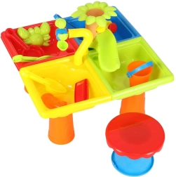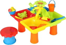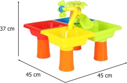 Turvaline ja vastupidav konstruktsioon on valmistatud ilmastikukindlatest materjalidest. Stabiilsed jalad ja ümardatud servad tagavad mängu ajal ohutuse. Komplekti kuulub ka rikkalik tööriistade valik, nagu labidad, rehvid, kastekann, ämber ja vormid, mis pakuvad lastele piiramatuid võimalusi dünaamiliseks mänguks.