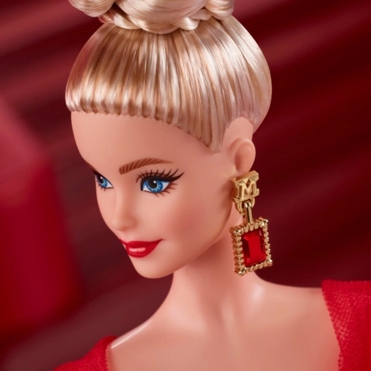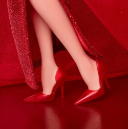 - Rubiinpunased kõrge kontsaga kingad täiendavad tema lummavat välimust ning kuldsed „M“ motiiviga kõrvarõngad viitavad Matteli traditsioonilisele logole.