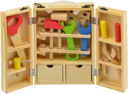 Puidust laste tööriistad praktilises kohvris! Suurepärane komplekt väikestele meistrimeestele, mis arendab motoorikat ja loovust.