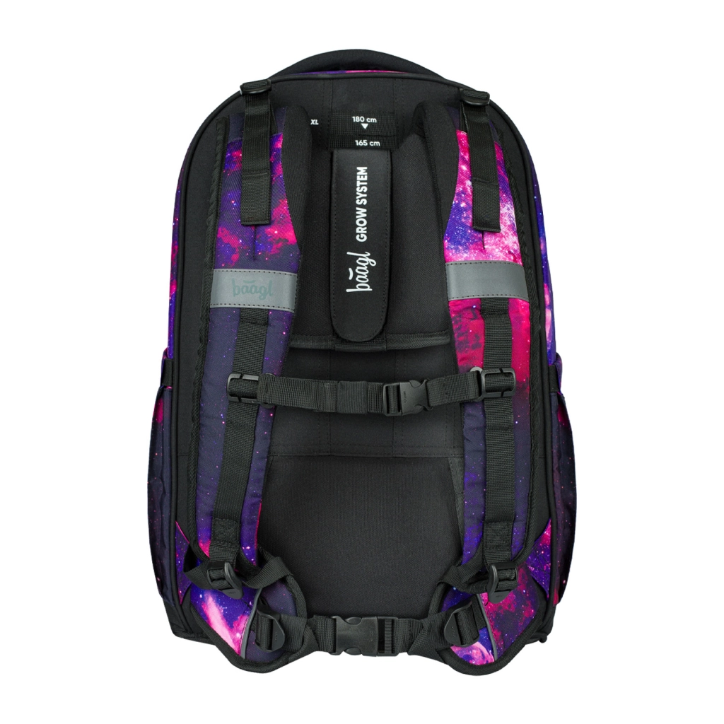 BAAGL kooliseljakott Skate max Galaxy sobib õpilastele ja tudengitele pikkusega 155–185 cm. Seljaosa on varustatud nihutatava seljasüsteemiga, mis võimaldab reguleerimist kuni neljale erinevale suurusele. Tänu taaskasutatud, veehülgavale kangale ja helkurelementidele on kott väga turvaline ja vastupidav.
