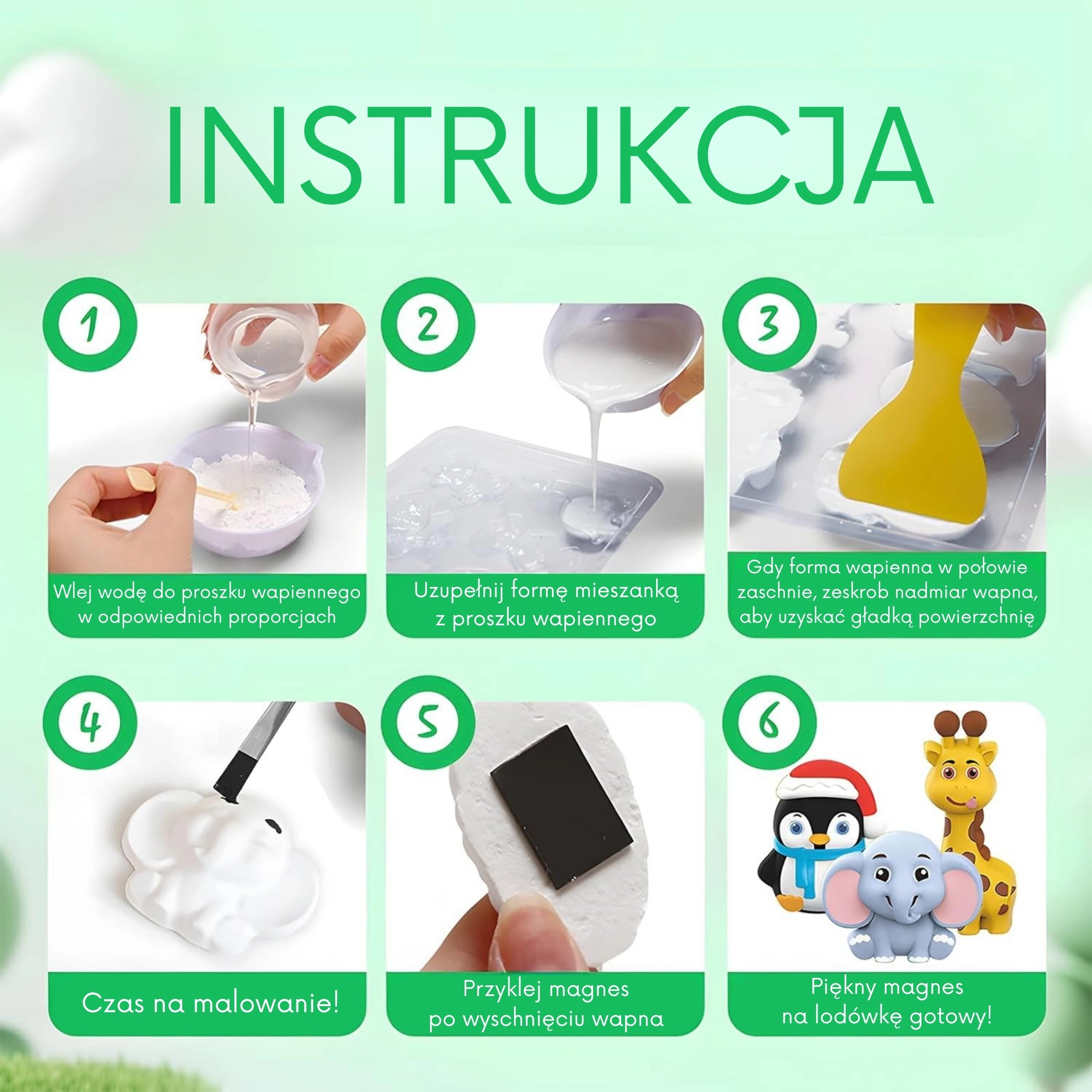 See nutikas 2-ühes komplekt ühendab valamise ja figuriinide värvimise üheks loovaks tegevuseks. Lapsed valmistavad kipsi, valavad motiivid vormi ning pärast kuivamist värvivad need erksate värvidega. Nii sünnivad ainulaadsed toakaunistused või originaalsed kingitused lähedastele.