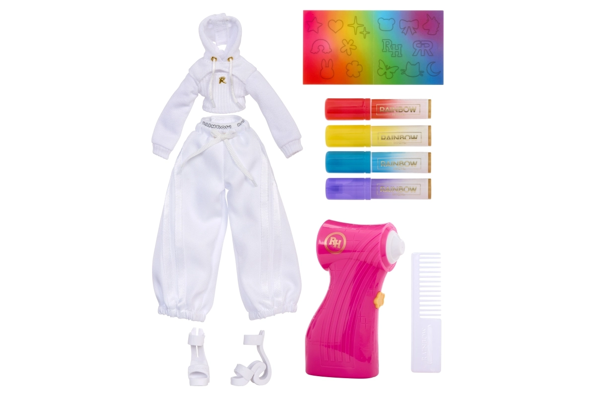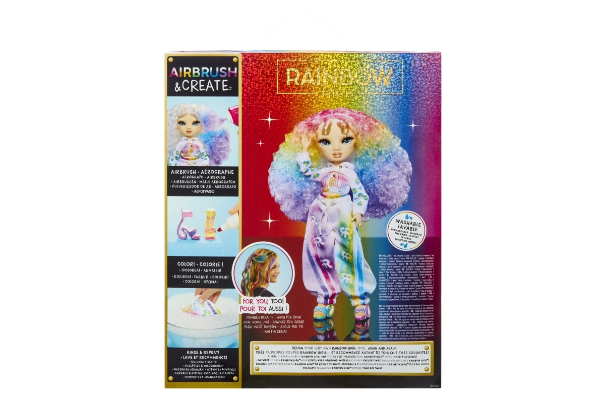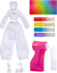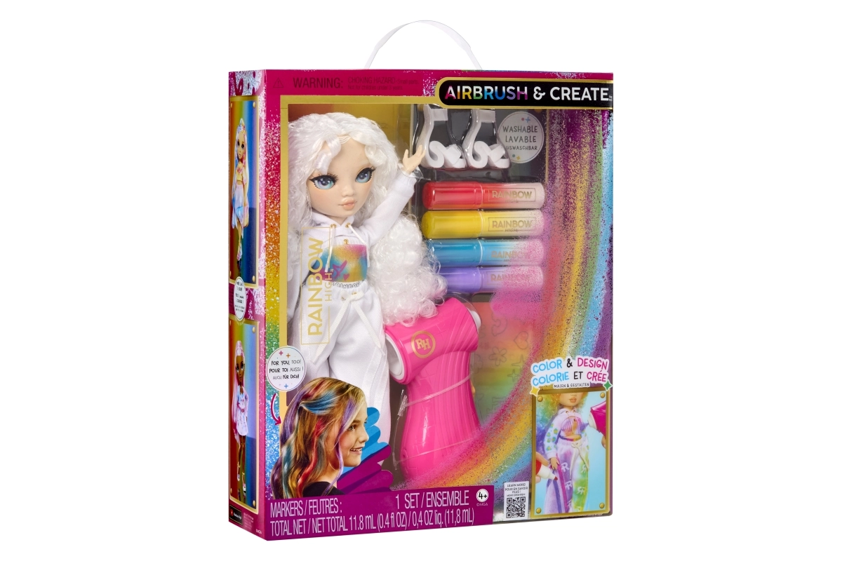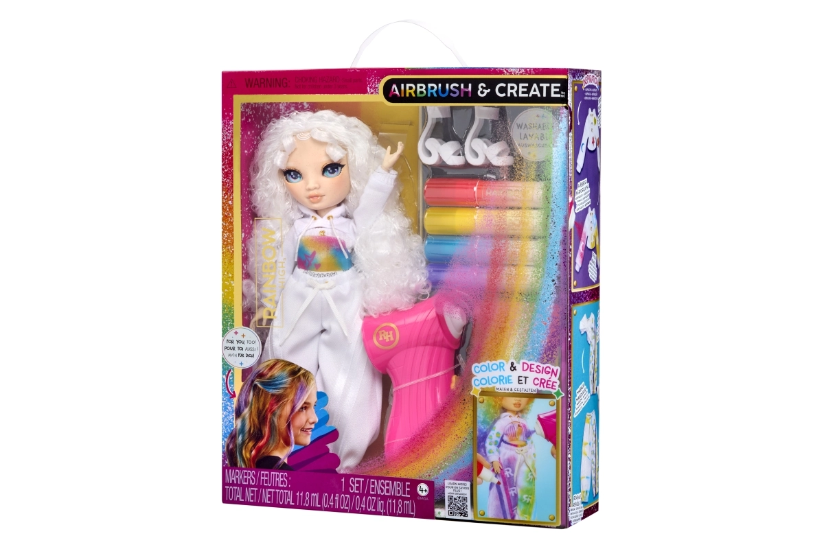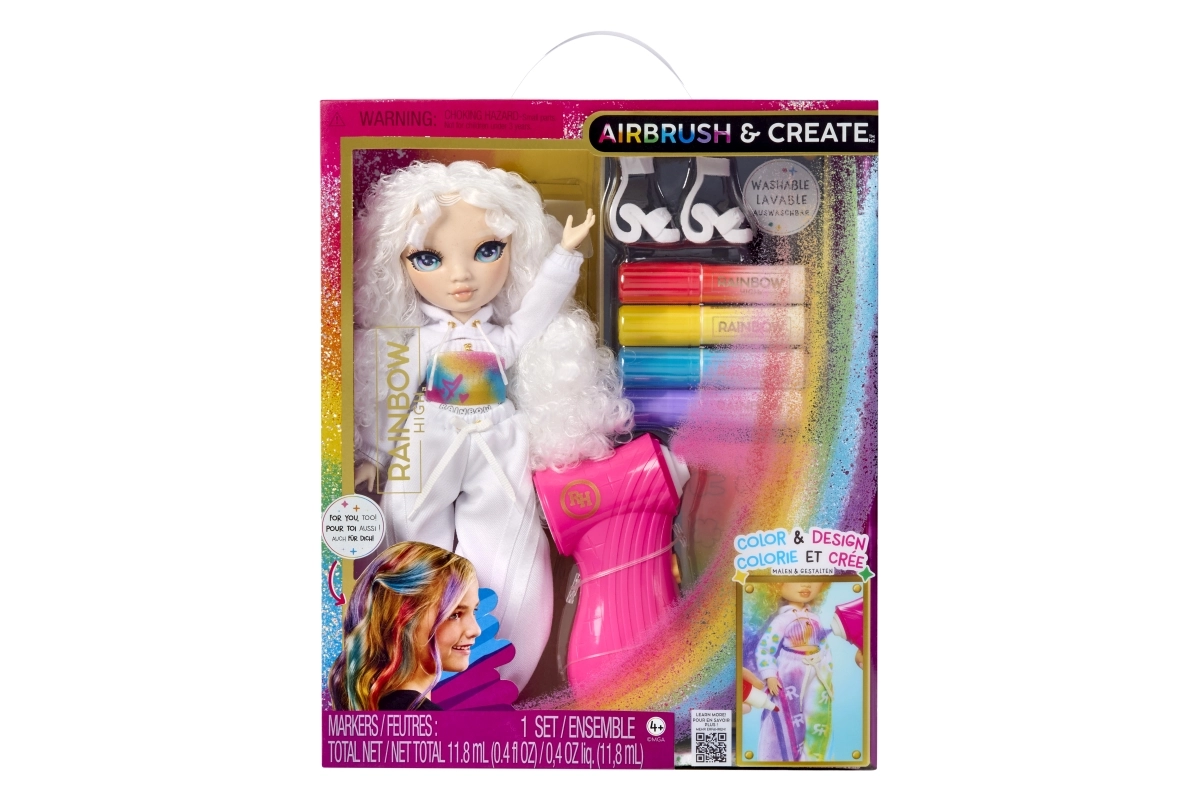 See loov nukk on nagu tühi lõuend – täiesti valges, valgete juuste ja fantaasiaks valmis rõivakomplektiga. Komplektis on neli mahapestavat vikerkaarevärvi vildikat (punane, kollane, sinine, lilla) ja praktiline airbrush lihtsaks varjutamiseks ja ühtlaseks värvi pealekandmiseks.