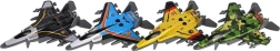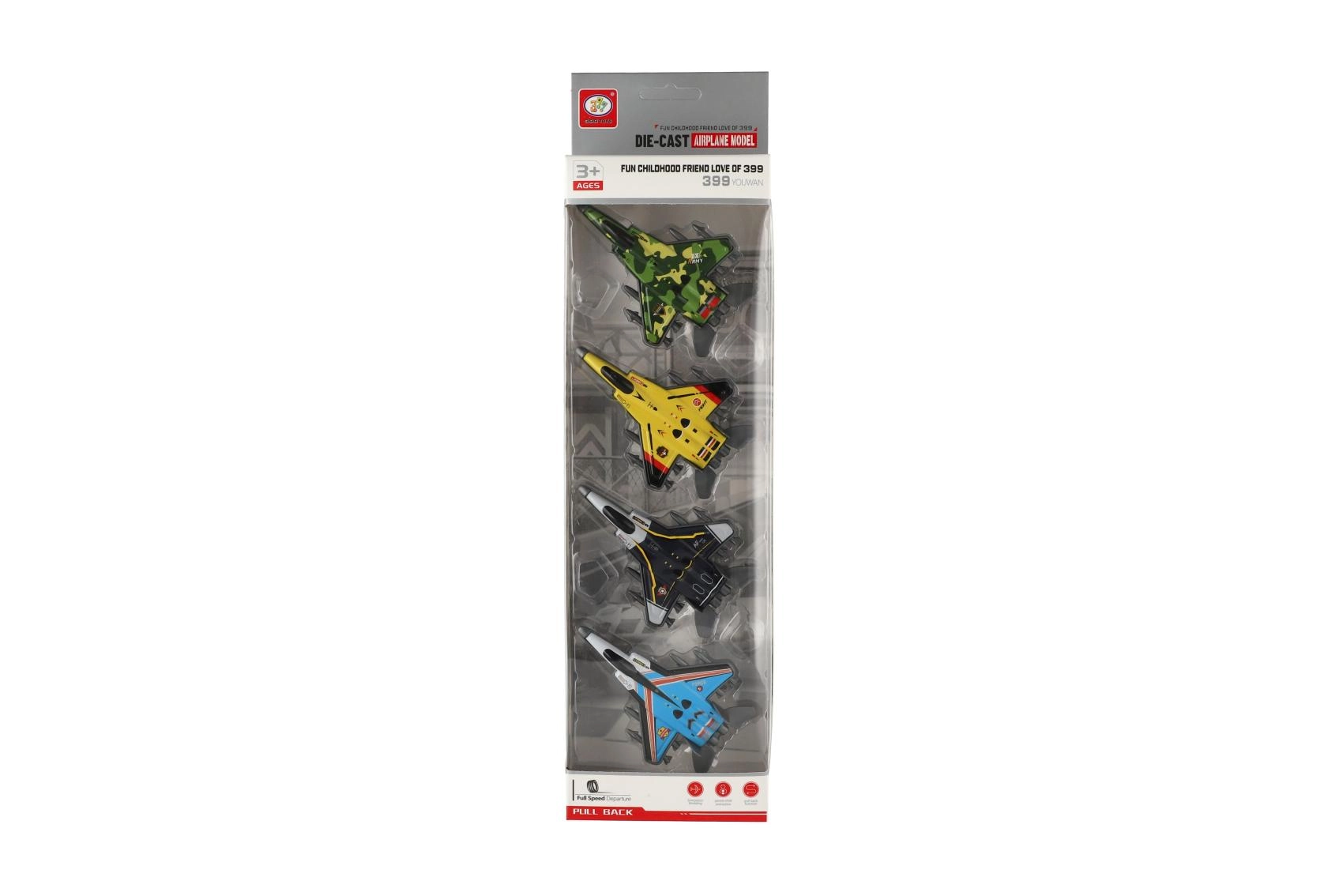 Neli moodsat hävituslennukit metallkerega ja tagasikerimise (pull-back) funktsiooniga pakuvad palju lõbu väikestele pilootidele. Igal lennukil on atraktiivne disain, tugev teostus ja unikaalne värvilahendus, mis muudab mängu mitmekülgseks ja põnevaks. Ideaalne 10 cm suurus sobib hästi lapse kätte ja lihtsustab käsitsemist.