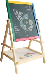 See puidust, kahepoolne ja multifunktsionaalne tahvel on suurepärane abiline igapäevaseks mänguks ja õppimiseks. Lapsed saavad harjutada kirjutamist, joonistamist ja esimesi arvutusi magnetilisel valgel küljel kuivkustutatava pinnaga või luua kriidiga traditsioonilisel mustal pinnal. Tänu ruumikale riiulile on kõik tarvikud alati käeulatuses.