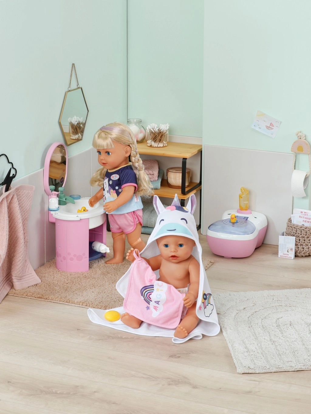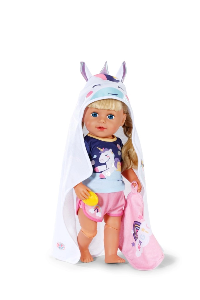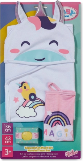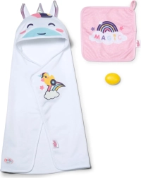 See võluv BABY born rätikukomplekt pakub kõike, mida vajad lõbusateks vannirituaalideks. Kaks rätikut vikerkaare ja ükssarviku motiiviga rõõmustavad iga väikest hoolitsejat, samas kui kapuuts vikerkaaresarve ja nunnude kõrvadega lisab igale kuivatamisele rõõmsa nüansi.