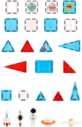 Tugevad magnetid tagavad kindla ühenduse, nii et konstruktsioonid hoiavad hästi kuju. Kosmoseteemaline komplekt sisaldab astronauti figuuri, raketti ja dekoratiivplaate, mis arendavad kujutlusvõimet ning toetavad loomulikult loovat mängu, ruumilist mõtlemist ja manuaalseid oskusi.