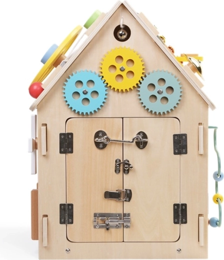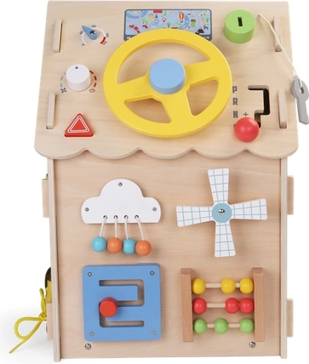 Puidust aktiivne mängumaja ühendab mängu ja õppimise. See pakub hammasrattaid, rooli ja käiguvahetust, arvelauda, labürinti, pöörlevat tuuleveskit ning eri tüüpi lukke ja sulge, et arendada peenmotoorikat, loogikat ja iseseisvust. Valmistatud kvaliteetsest looduslikust puidust turvaliste, siledaks lihvitud servadega ja mittetoksiliste värvidega. Suurepärane valik uudishimulikele lastele alates 3. eluaastast.