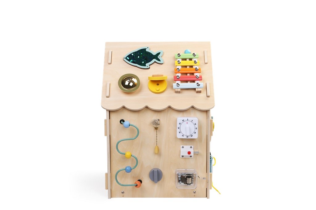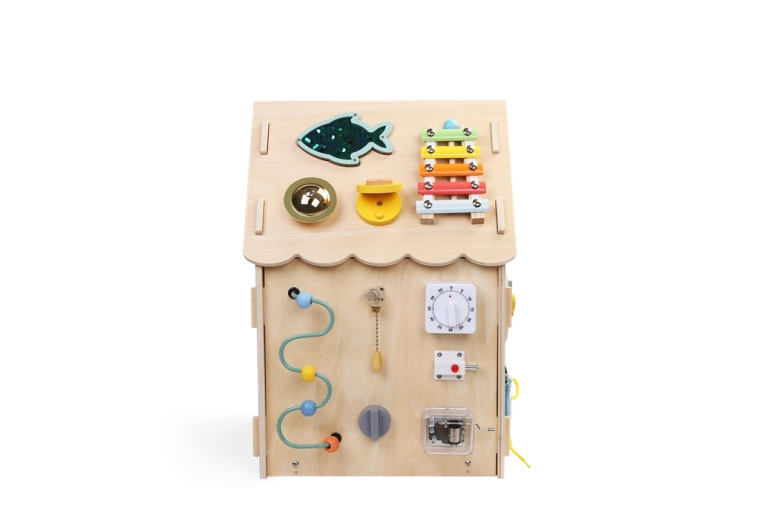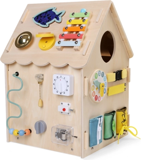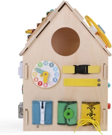 Mängumaja toetab keskendumist, kannatlikkust ja igapäevaseid oskusi, nagu tõmbluku sulgemine, nööpimine, paelte sidumine ja pandlate kasutamine. Tugev puidust konstruktsioon, siledad servad ja mittetoksilised värvid tagavad turvalise kasutuse.