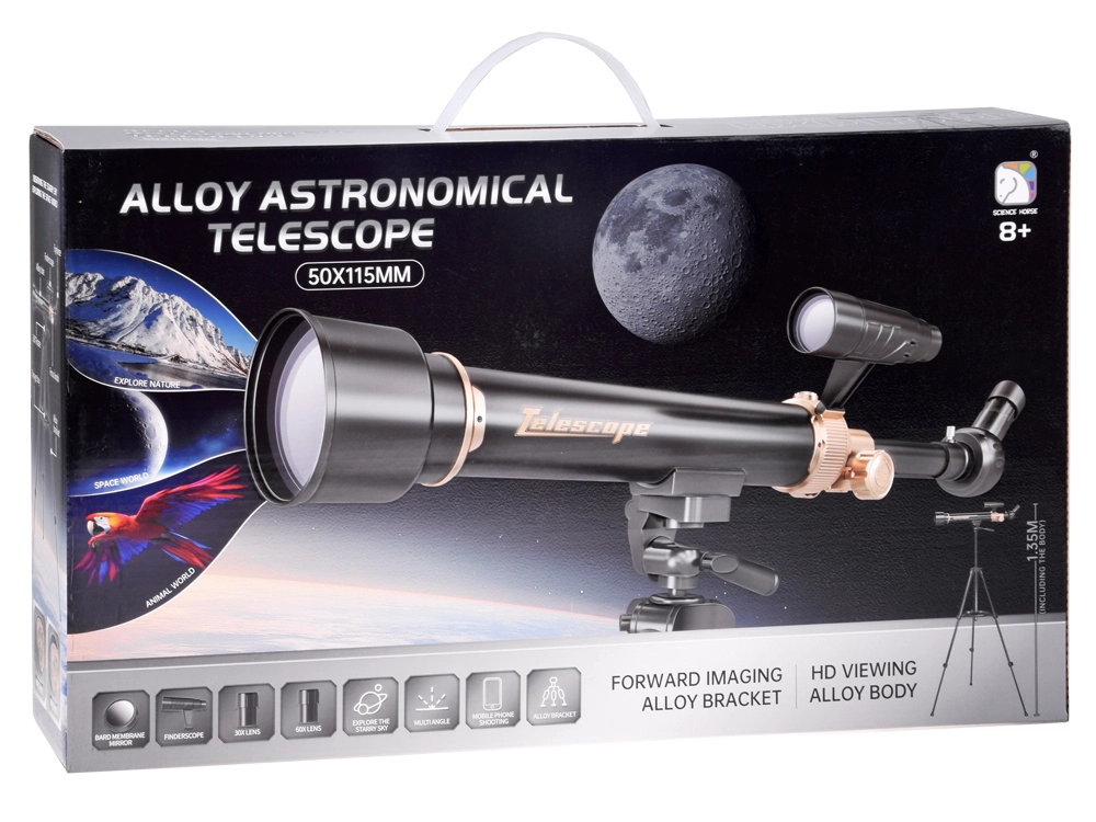 Alusta universumi avastamist selle mitmekülgse astronoomilise teleskoobiga. See pakub 30x ja 60x suurendust, 500 mm fookuskaugust ning stabiilset 1,3 m alumiiniumstatiivi. Komplektis on täielik lisatarvikute komplekt, sealhulgas okulaarid, otsija, zeniitpeegel ja telefonikinnitus. Komplekti kuulub ka spetsiaalne membraanfilter Päikese ohutuks vaatlemiseks.