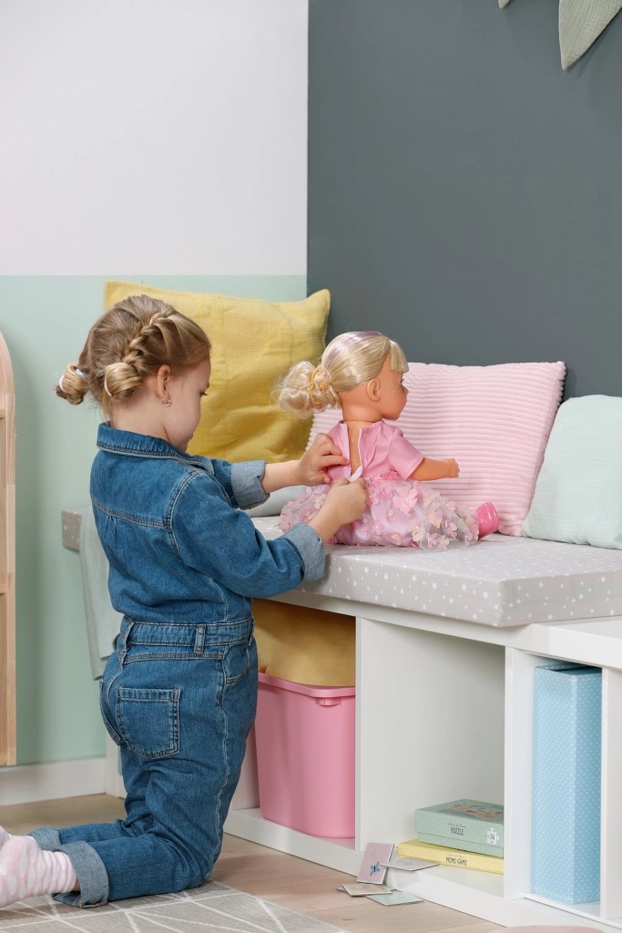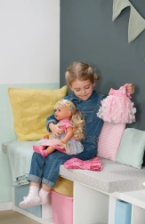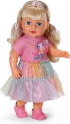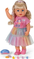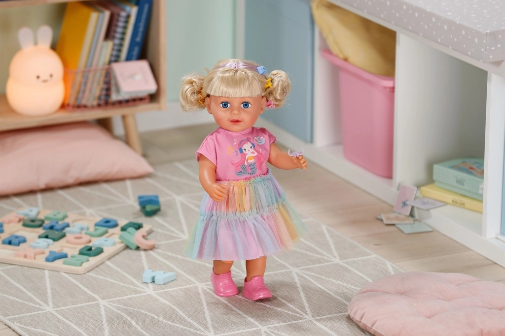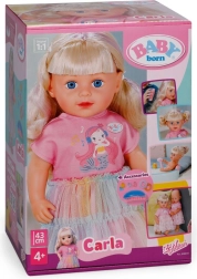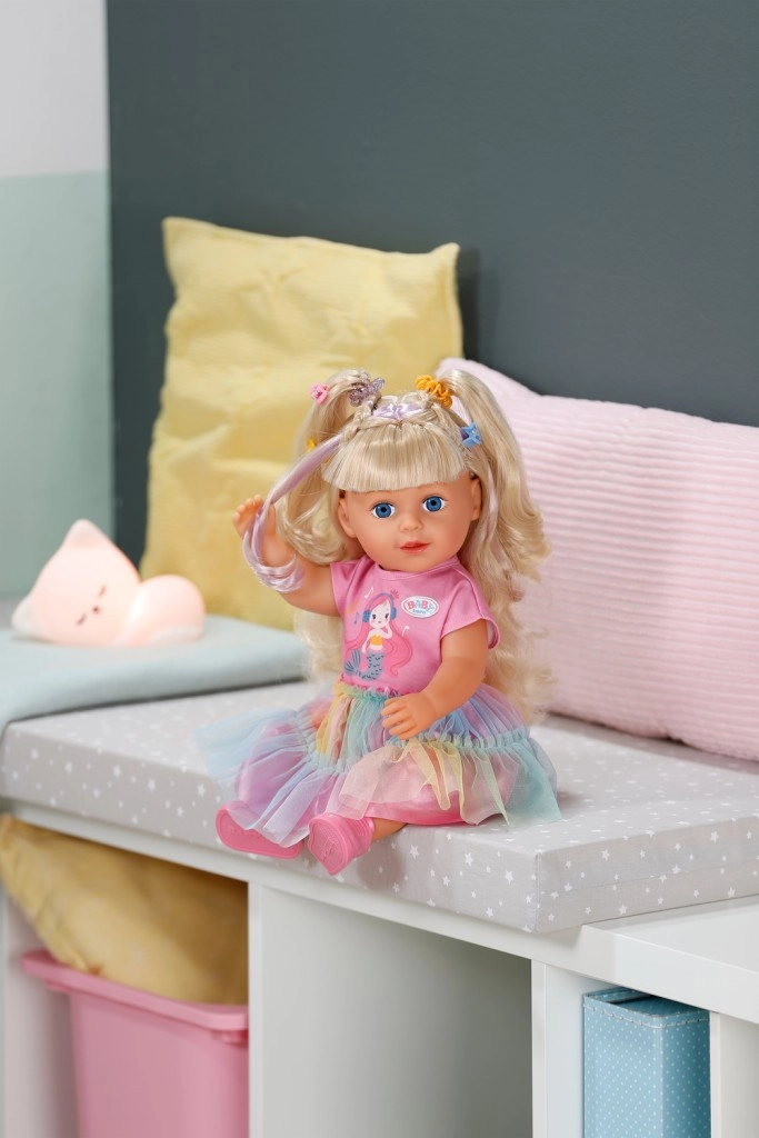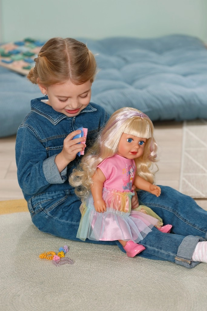 Avasta nukk BABY born Carla 43 cm pikkade kvaliteetsete nailonjuustega, mida on lihtne kammida. Komplektis on 7 juuksestilistiku aksessuaari, nukul on liikuvad liigesed, ta oskab ise seista ning tänu tugevale kehatüübile saab vannis vannitada. Stiili täiendab armsa lõikega T-särk, vikerkaarevärviline tüllseelik ja roosad kingad – ideaalne loovaks mänguks ja juuste stiliseerimiseks.