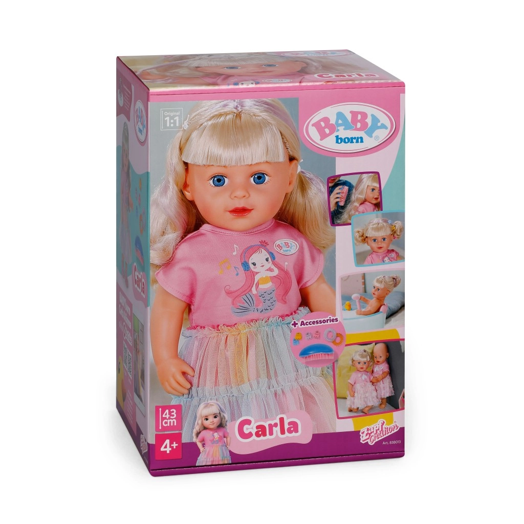 Nukk BABY born Carla pakub lastele rohkelt võimalusi loovmänguks. Pikad ja pehmed nailonjuuksed sobivad suurepäraselt kammimiseks, hobusesabade tegemiseks ning patside punumiseks. Komplektis olevad 7 aksessuaari – hari, patsikummid ja klambrid – toetavad fantaasiat igapäevases stiliseerimises.