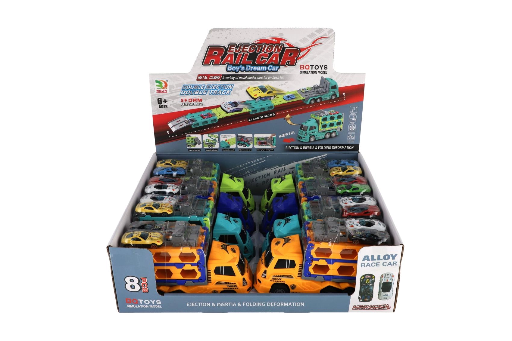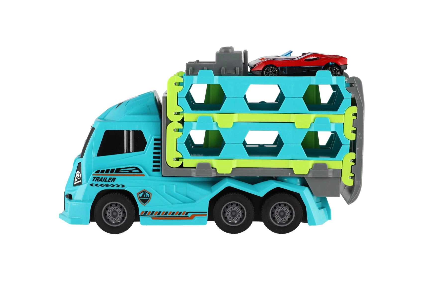 See vastupidav plastikust veok toimib väikeste võidusõiduautode vedukina ja pakub lastele palju tegusat mängurõõmu. Tänu hõõrdejõu mehhanismile stardib see pärast tagasi tõmbamist iseenesest, sobides suurepäraselt dünaamiliseks mänguks vaibal või siledal pinnal.