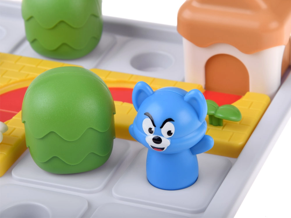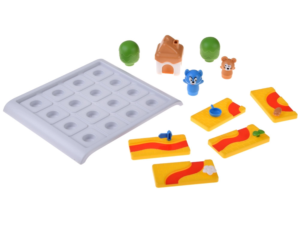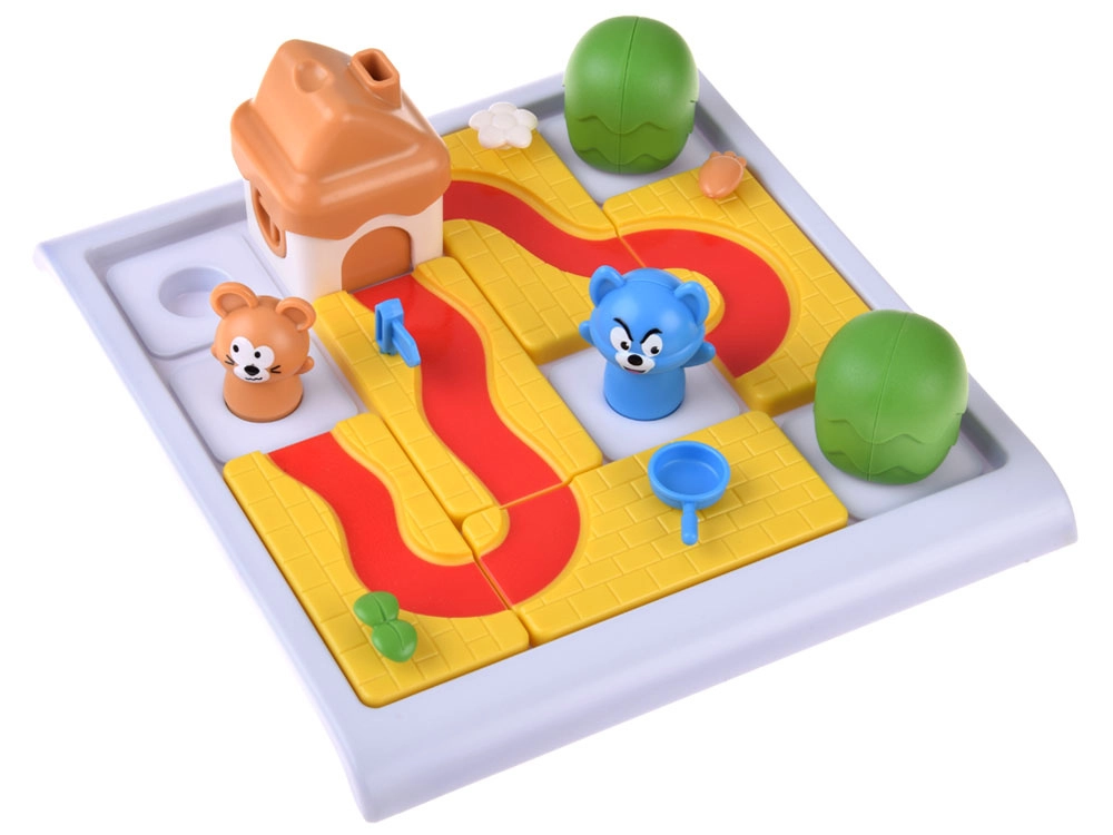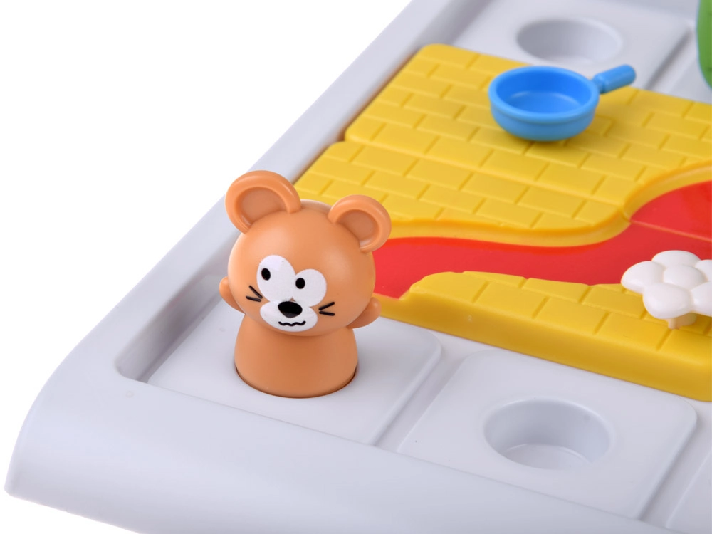 Tugevad plastkomponendid ümarate servadega – rajatükid, juustumajake, puud ning hiire ja kassi figuurid – toetavad peenmotoorikat ja lihtsat käsitsemist.