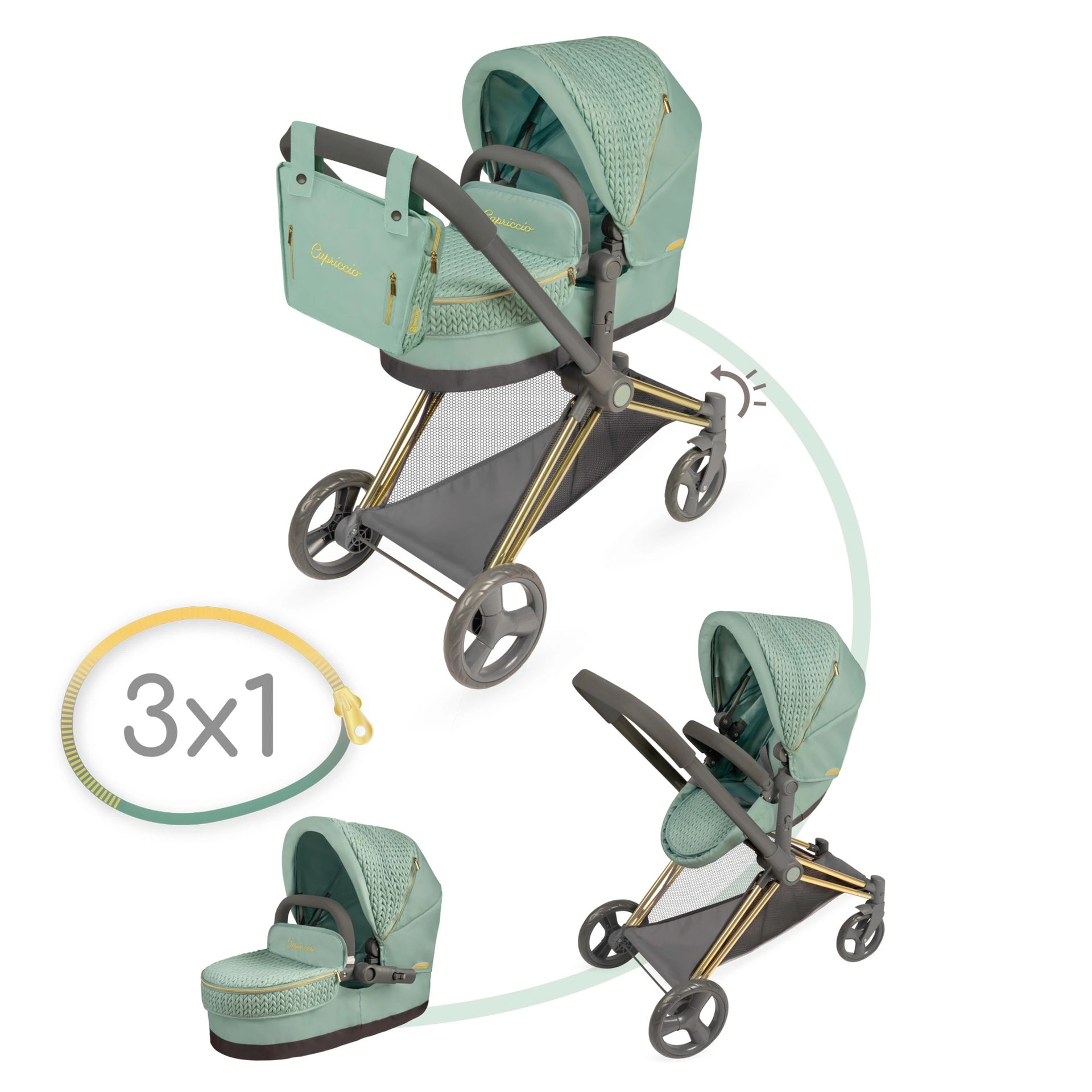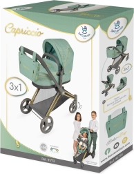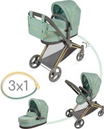 Elegantne 3‑in‑1 nukuvanker kollektsioonist CAPRICCIO moodsas mentoolrohelises toonis pakub sügavkorvi, spordiosa ja kandekorvi. Vankril on reguleeritav kaarvari, pööratavad esirattad lihtsaks manööverdamiseks, panipaigakorv ning eemaldatav kott kuldsete tõmblukkudega. Tänu kokkupandavale raamile ei võta palju ruumi ja sobib lastele alates 3. eluaastast.