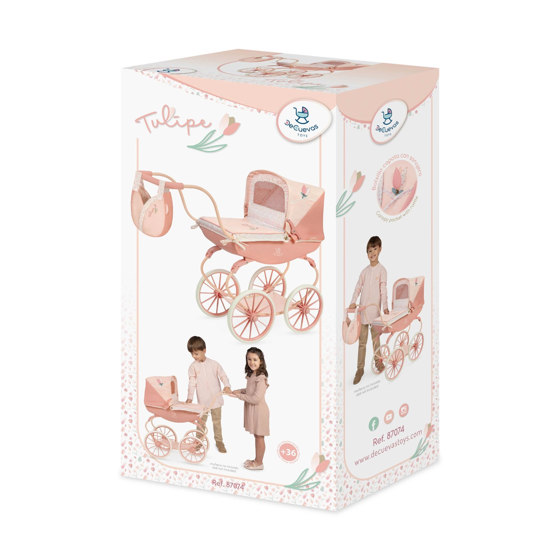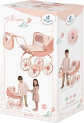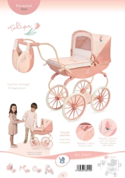 Tulipe 2025 kollektsiooni sügav nukuvanker paistab silma täpse viimistluse ja kauni kombinatsiooniga heledamatest ja tumedamatest lõhetoonidest pastellides, mida täiendab õrn lillemuster. Tänu õõtsumisvedrudele ja pehmele madratsile saab nukk mugavalt „magada“, samal ajal kui kokkupandav kapuuts ja vanni kate kaitsevad jalutuskäikudel.